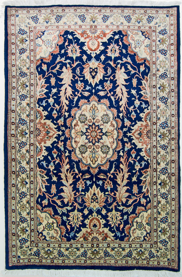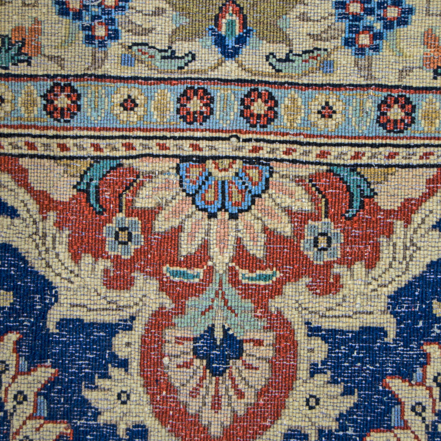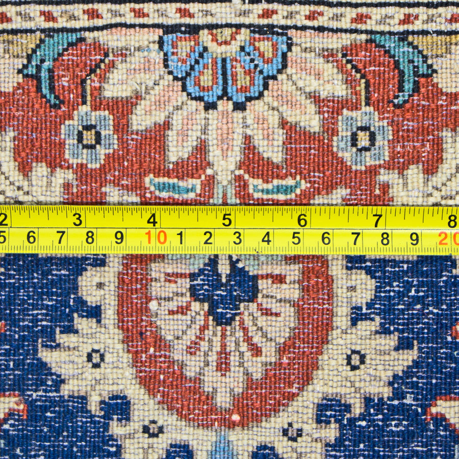 Explore the rich details and vibrant colors of this authentic Persian rug. Climing vines, blooming florals, and more fill the central space of this Veramin style work of art. The soft pink pops against the dark blue background. This rug features traditional triple borders filled with more floral motifs in shades of green, yellow, and pink. It's hand-crafted by Iranian artisans who use traditional methods and motifs common to the region. A blend of wool and cotton allows the rug to be both long-lasting and soft for you to enjoy. The size and beauty makes this rug a perfect display piece for your living room.