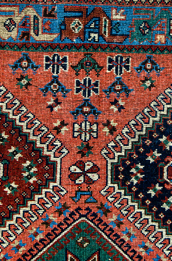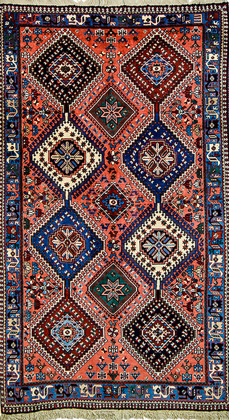 Explore the intricate patterns and techniques of the Yalamah tribe with this authentic Persian rug. Large diamond medallions rimmed with signature Yalamah shapes makes the center focus of this rug. Dual borders with various intricate patterns round out the look of the rug. A stunning combination of bright blue, salmon pink, tans, and browns went into this work of art. Yalamah artisans hand-knotted this authentic Persian rug using traditional methods and patterns. It's woven with pure wool to ensure the rug remains top quality for decades. You'll enjoy this tribal beauty in your collection for generations.