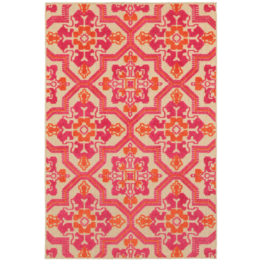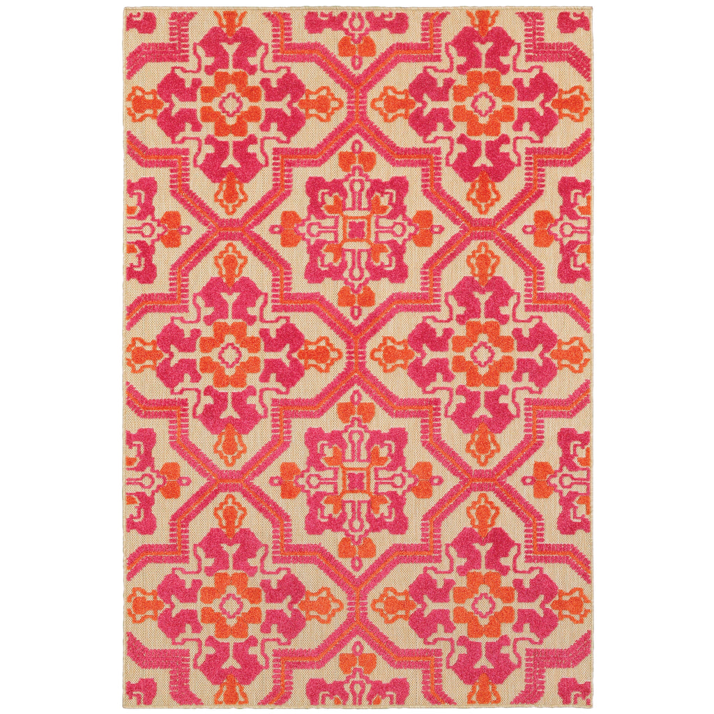The Cayman collection is machine woven of 100% polypropylene featuring a high/low effect utilizing textured, tri-colored yard in a multi-level cut pile and flat weave construction that can be used inside the home as well as outdoors. Vibrant shades of tangerine, lime, Mediterranean blue, cherry red, charcoal and bright strawberry pink pop on the natural sand colored background in crisp geometric and global inspired patterns.