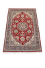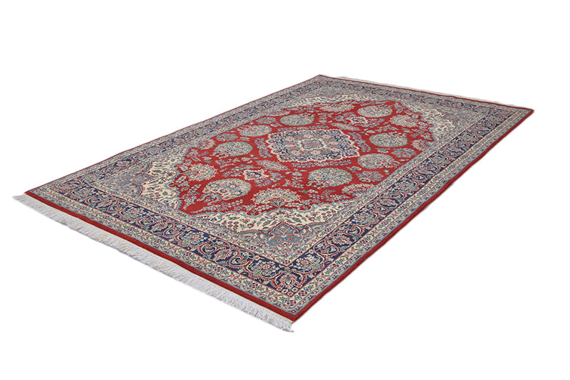 Bright pattern, with a noticeable medallion in the middle makes this Pakistani tribal rug an extraordinarily beautiful and most desired floor piece to enrich a living room. This rug is complimented and glorified for its delicate design and weaving technique. Made of high-quality wool and cotton, measuring 6' 1" x 9' 3" with prominent red, blue and beige colours among repetitive motifs in a symmetrical pattern along with medallion in the middle makes it unique in any frames. Genuinely, a most preferred rug for its all-over design and overlooking colourful patterns, which is all you need to add the splendour to your living room