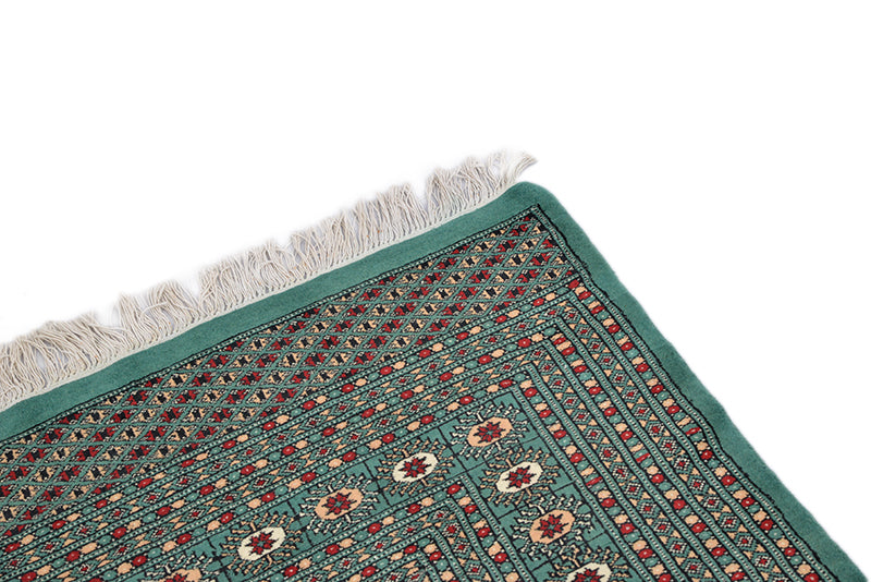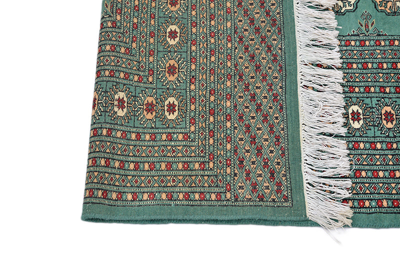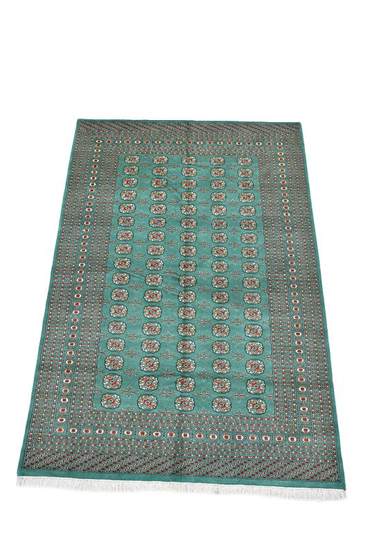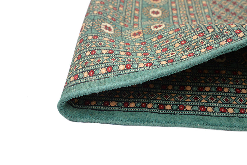Graceful in its entirety is the beautiful Kashmiri rug with green shade background that highlights delicate flowers forming an all over carpet design. The classic oriental borders feature tiny symbols contrasting to the field. This sets off the entire design like a garden border, the effect creating a stunning combination of delightful motifs and elements. This sophisticated rug in large size features flowers in soothing green color arranged in regular connected patterns along the rows of the field, creating a feel of formal rows in horizontal and vertical pattern. This antique 9'2"x6'2" rug crafted out of a soft blend of cotton, wool and silk have a symmetrical feel in every direction. This vibrant Persian design would surely complement any home decor theme.