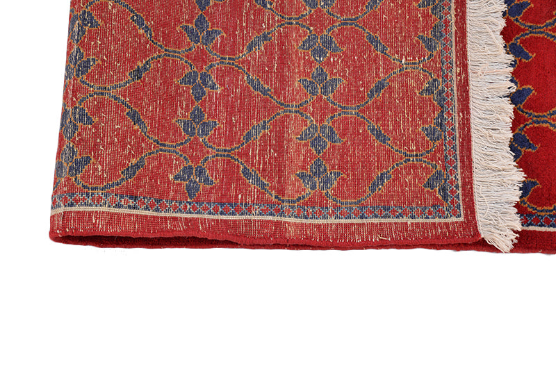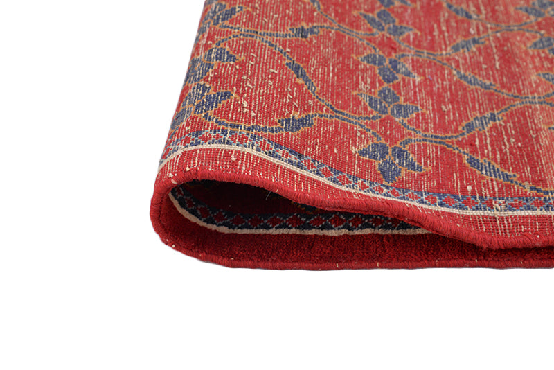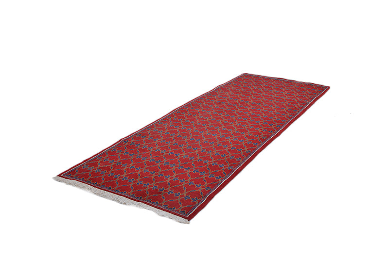 Add instant fashion to any room decor with a luxurious Pakistan Kashmiri style runner rug hand-made by the masters of Kashmiri art who possess one of the proudest traditions in the world. This distinctive antique piece exemplifies simultaneously some of the most desirable characteristics and qualities of Persian Kashmiri rugs while functioning as a unique piece. The intricate design and composition make this rug so different. Symmetric leaf motif pattern in blue decorate the entire bold red field. The choice of bright and bold tones and contrast make this rug highly interesting and irresistible. This 9'10"x3'6" rug is an impressive decor piece that brings beauty and luxury to any home.