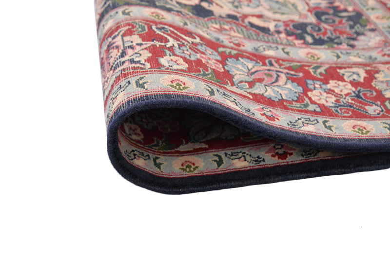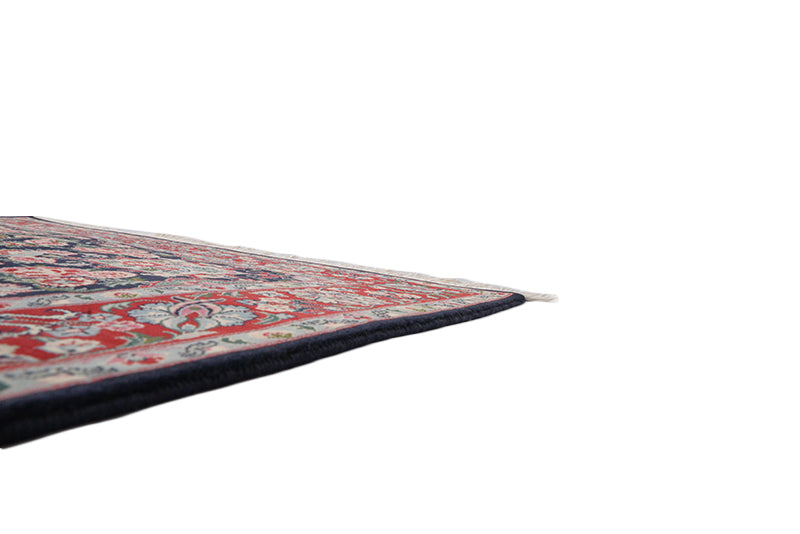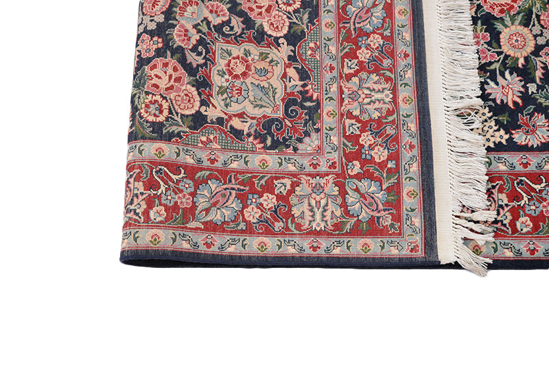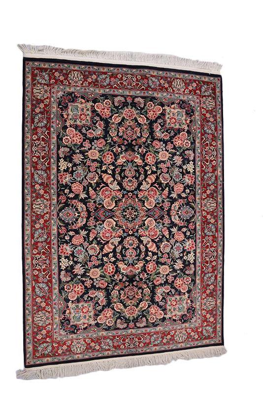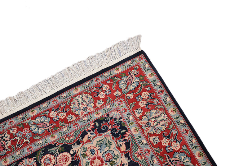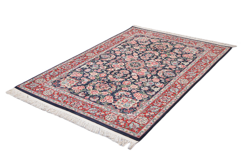 Impart a royal look to your living room decor with our exclusive hand-woven Kashmiri rug hand-crafted to perfection by skilled artisans. This high-quality, thick carpet features soft texture and durability owing to its special blend of cotton, wool and Kashmir silk for which these Pakistani rugs are famous. Lustrous and brightening color makes the house cozy and welcoming. The rug measures 5'9" x 4' and suits home and office whether used in the entrance, dining room, living room or bedroom. The softness and Persian style of the carpet adds uniqueness to your interior. The cool color matching involving shades of red, green and blue give a soothing effect to your eyes.