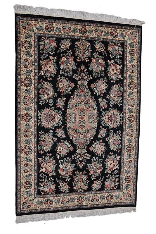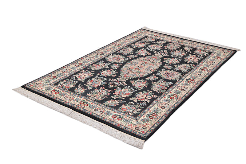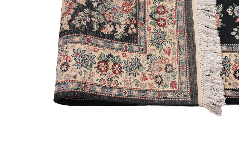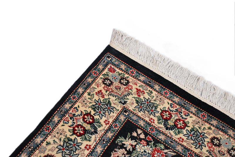 Own one of the rarest hand-made rugs from the Pakistan Kashmiri collection to add a unique touch to your interior. This rug is designed to merge traditional patterns with distinctive and highly sophisticated color tones. Hand-knotted to perfect and quality by skilled artisans, this rug features an exceptional weave quality that exceeds your expectations. The unmatched softness of cotton, silk and wool blended together in a special way makes this carpet durable and the genuinely dyed colors are sure to stay for years to come. This piece of decor is produced using the finest quality wool, cotton and silk with the expert craftsmanship followed from weaving to finishing that really let this product live long. Awesome combination of classic beige and black colors brought together in traditional floral pattern enhances the beauty of the space.