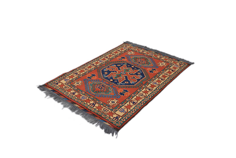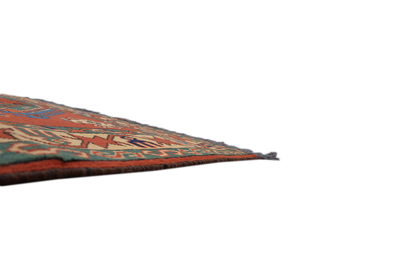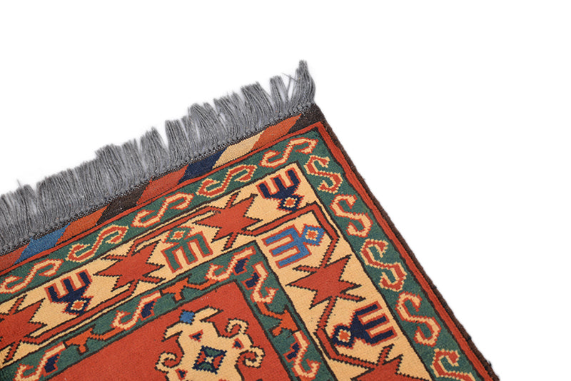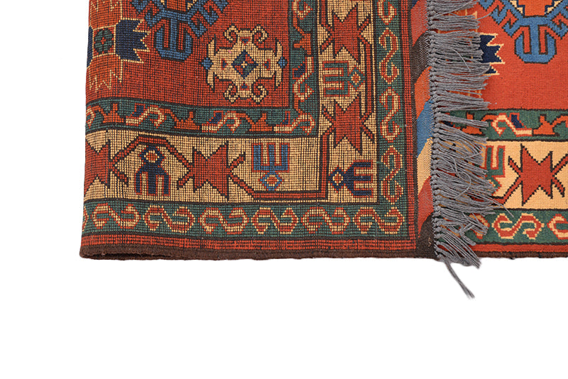 Catch a lot of attention from visitors when you place the vintage Persian rug in your living room, bedroom or patio to complement your interior. Using skillfully placed diamonds and stars throughout the field made up of bright and bold colors like red and blue, the artist elegantly divides the attention while grounding several elements present throughout this rug. This chic Kashmiri rug crafted by hand using superior quality wool, cotton and silk feature numerous motifs and elements belonging to the ancient Persian styles while utilizing a powerful color palette that complements the geometric elements contained within. Hues are picked carefully to create the right amount of contrast resulting in a highly vibrant display of movement making this Pakistani rug one-of-a-kind in a wide range of environments.