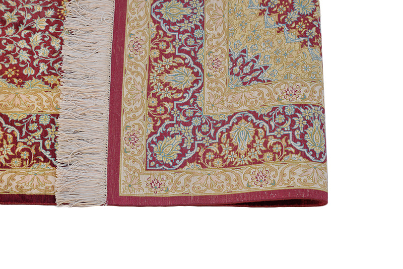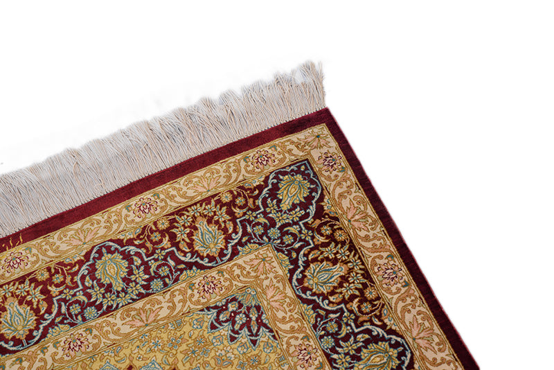 If filling in with a add a dash of freshness and newness is what you have been craving for, then you should move on to this Qum Silk rug! The master weavers’ intricate weaving and minute hairline details including the fine lines, drapes, waves, floral motifs and wrinkles of the typical Qum Rug are seen in this masterpiece as well! Inspired by the Persian masters, this Qum Rug comes filled with complexity, which you don’t get to see in many other counterparts! This rug in maroon, yellow and beige combination is worth grabbing reputation with its woolen make. Uncompromising quality is what distinguishes this Qum rug. Knotted by hand by professional carpet weavers, this incredible masterpiece replenishes your whole interior with its defining style and knot density.