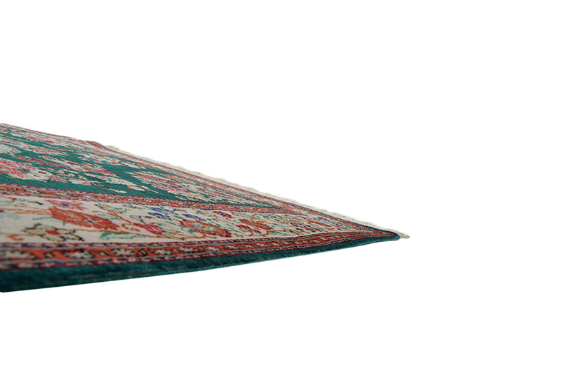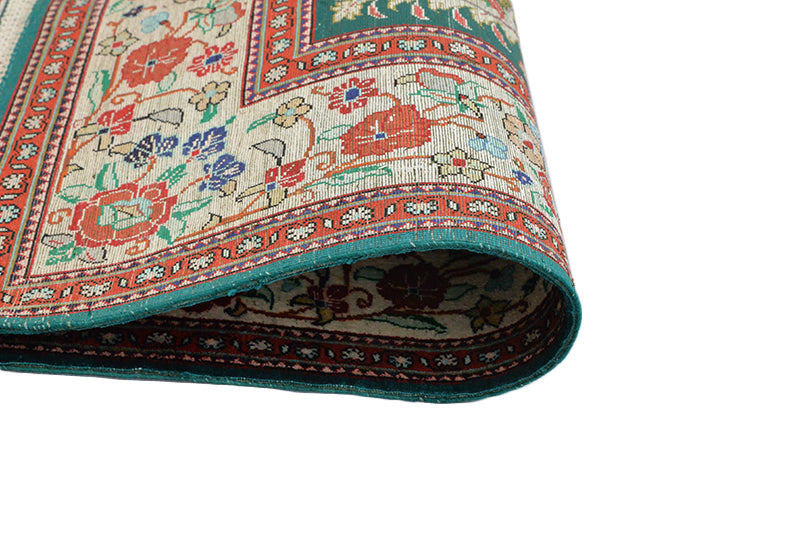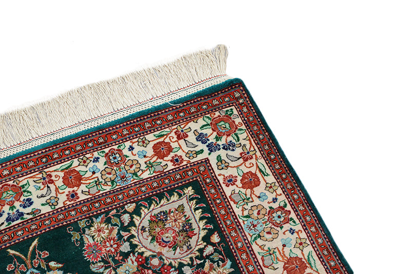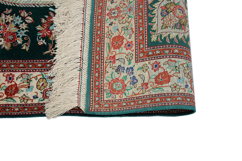 The classic line features along with the traditional hand-knot in this Qum rug takes your furnishing to a yonder level! The master weavers’ intricate weaving and minute hairline details including the fine lines, drapes, waves, floral motifs and wrinkles of the typical Qum Rug are seen in this masterpiece as well! Inspired by the Persian masters, this Qum Silk Rug comes filled with complexity, which you don’t get to see in many other counterparts! This rug in black, yellow, and light green combination is worth grabbing reputation with its woolen make. Uncompromising quality is what distinguishes this Qum rug. Knotted by hand by professional carpet weavers, this incredible masterpiece replenishes your whole interior with its defining style and knot density.