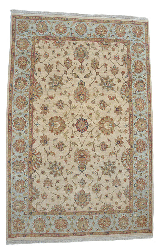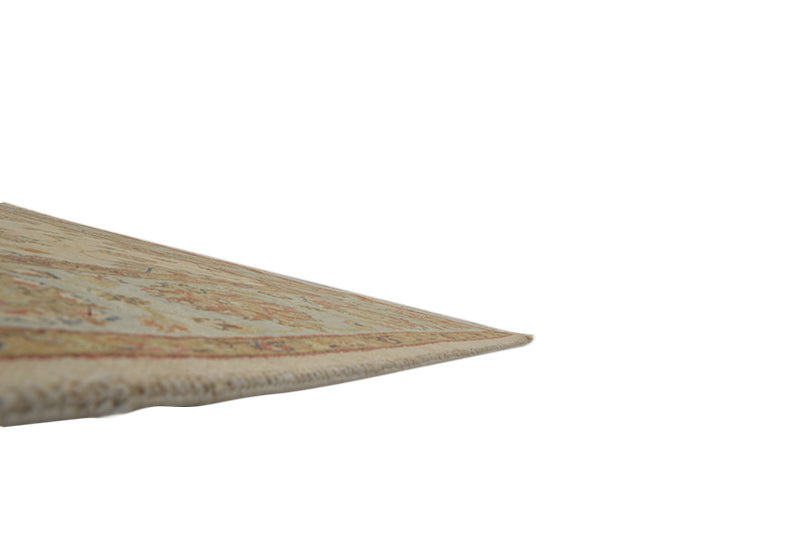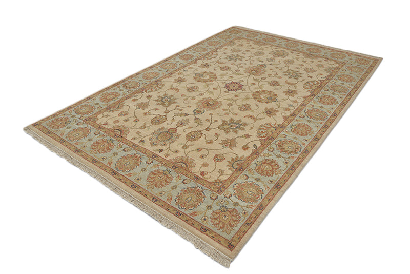 Exceptionally artistic, and gorgeous, this old-fashioned Persian Sultanabad rug in ivory background features a breathtaking combination of earthy hues and autumn colors to catch a lot of attention. The outer border features delightfully twisting vines and stems surrounding color-rich flowers. The same curls create the center of the large rug where they gather in large numbers to surround a lot of flowers. Hand-knotted in wool, the rug looks elegant yet trendy to get the viewer's eyes following. Decorating your living room or patio is interesting with this Persian rug that measures 5'9" x 8'10". Make this tribal rug your next show-stopper and get lots of compliments from guests!