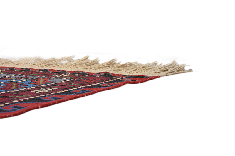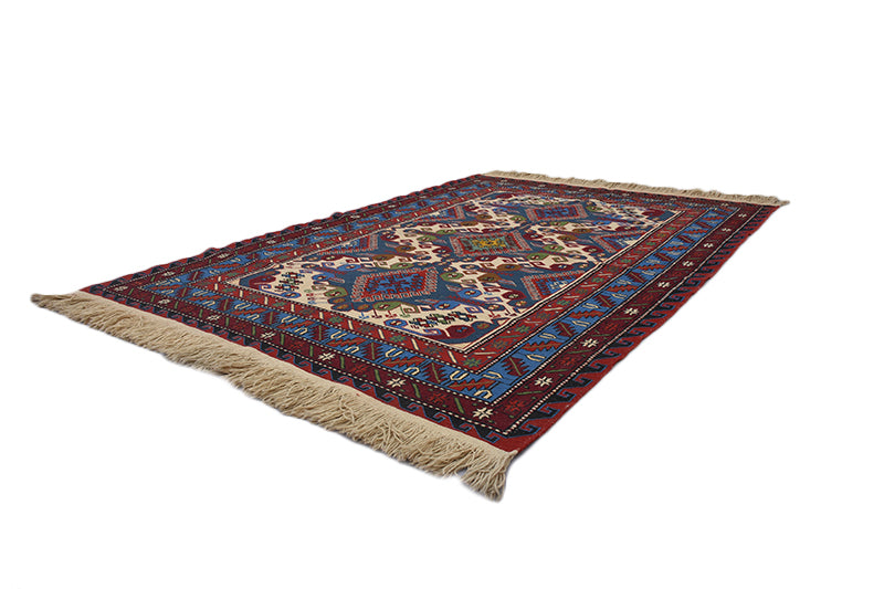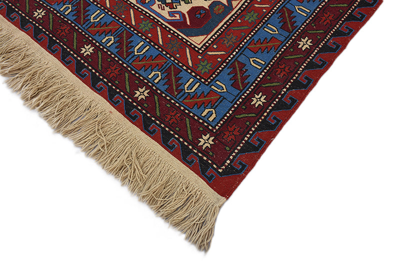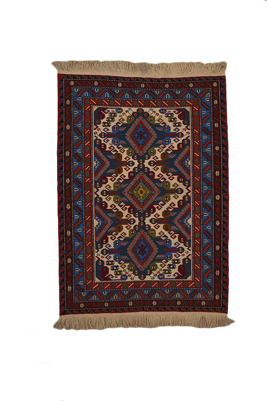 So pleasing and so attractive, this remarkable rug from the house of Sumak looks extremely posh while on your floor! Remember, you will never crib for those spills and stains anymore as this rug comes built on wool and cotton, promising durable quality. Its darker shades of blue, red, and beige make it more attractive. The whole rug has a historic technique, which enlivens the entire ambience with completeness. Making it more special is its flat weave technique with ‘no knot’ weaving process – all that this rug has underwent is the intermingling of warp and weft strands to depict those three big motifs in the center, surrounded by a border with rich details and several other tribal symbols. This pretty rug remains pretty even on those high traffic areas.