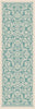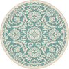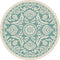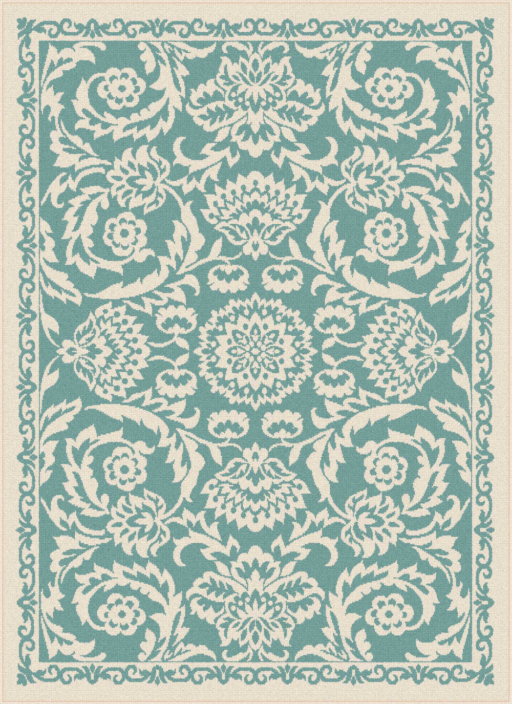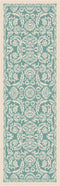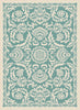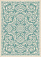 This softly patterned area rug imparts a hint of antiquity for a relaxing sentiment. Weather-resistant polypropylene fibers keep this rug looking great for years to come. Perfect for an outdoor room or sunroom. Easy style for any type of decor. Aqua and cream.