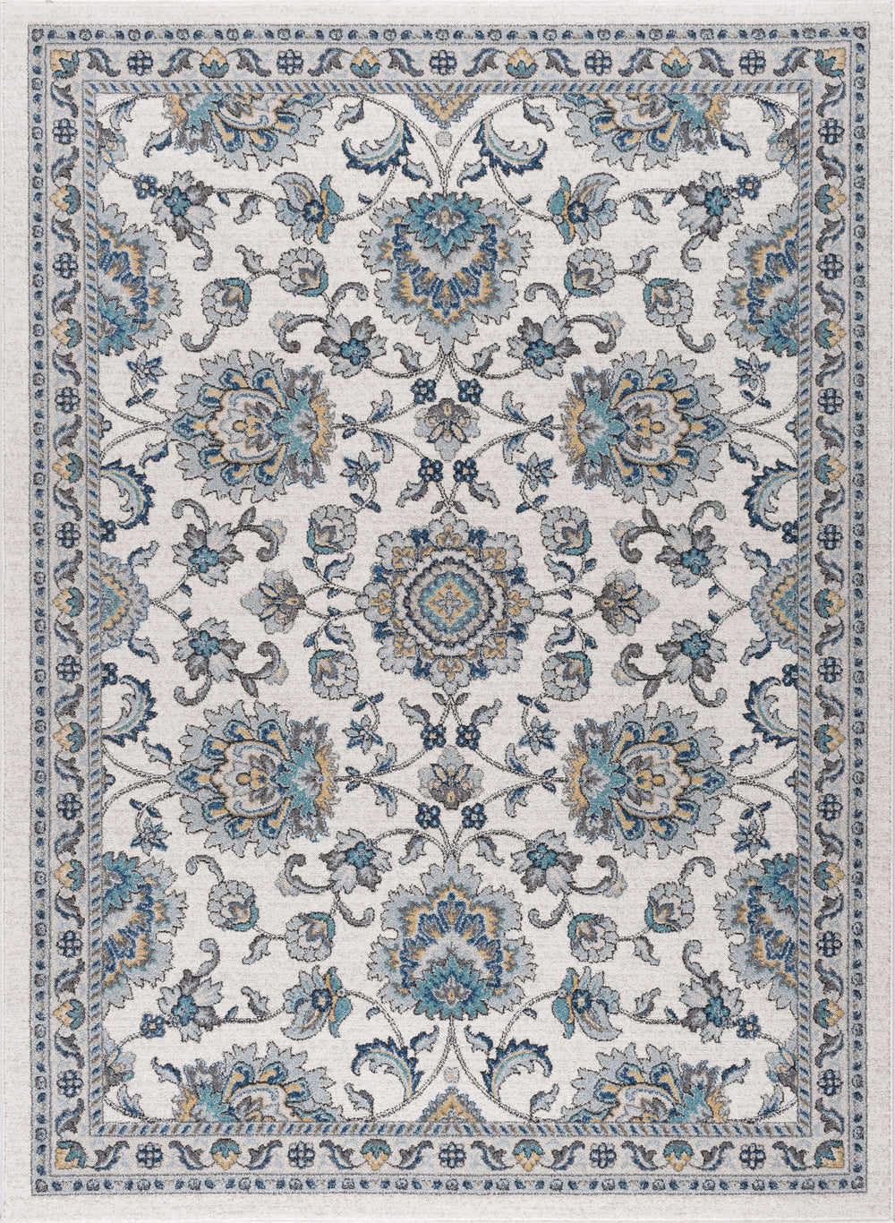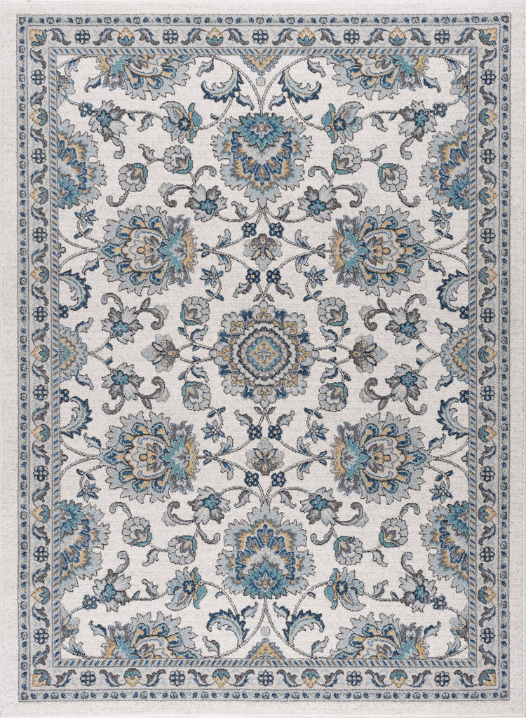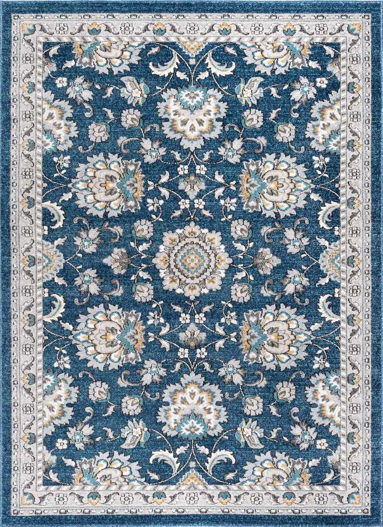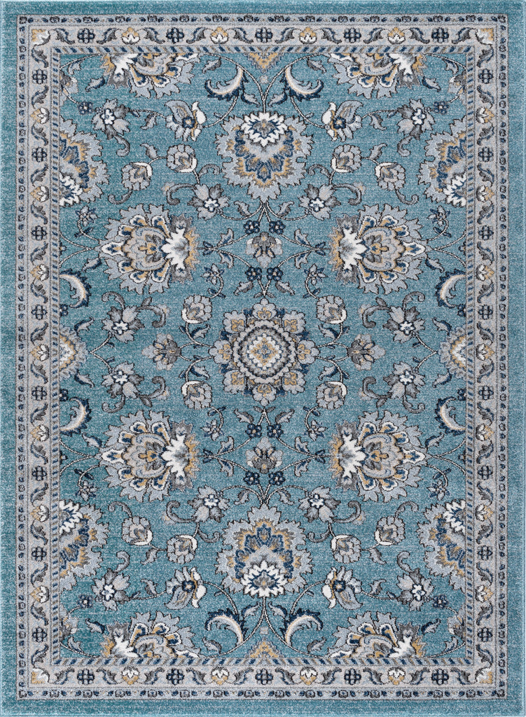 Oriental styling and soothing hues form a traditional area rug with updated character. Springy frieze yarn imparts a lively texture. The look of luxury for a great value! Tranquil colors of indigo, aqua, gray, ivory and a touch of gold. Polypropylene yarn with jute backing. Vacuum on high pile setting to restore pile, spot clean with mild detergent and water.