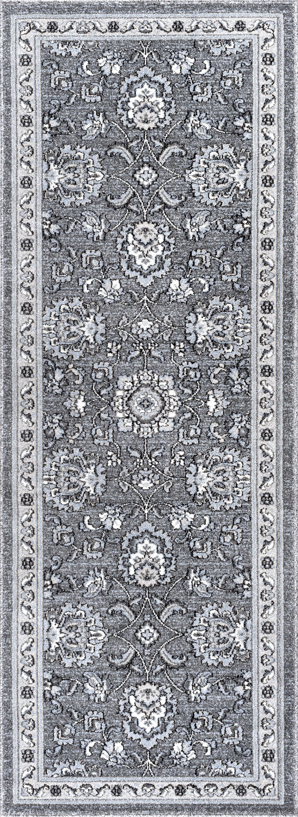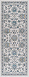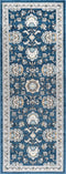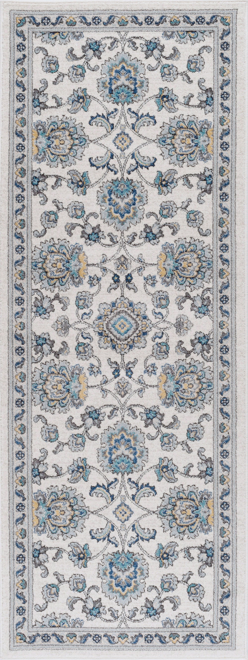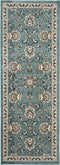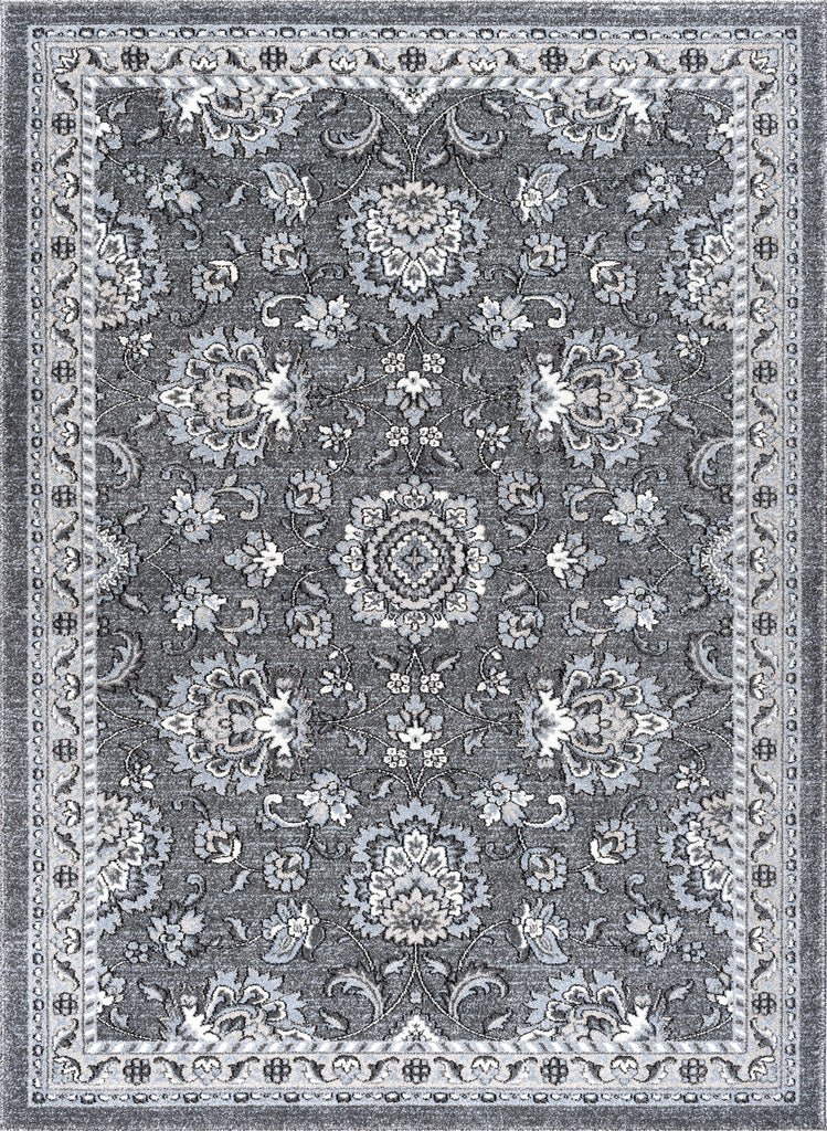 Oriental styling and soothing hues form a traditional area rug with updated character. Springy frieze yarn imparts a lively texture. The look of luxury for a great value! Tranquil colors of indigo, aqua, gray, ivory and a touch of gold. Polypropylene yarn with jute backing. Vacuum on high pile setting to restore pile, spot clean with mild detergent and water.