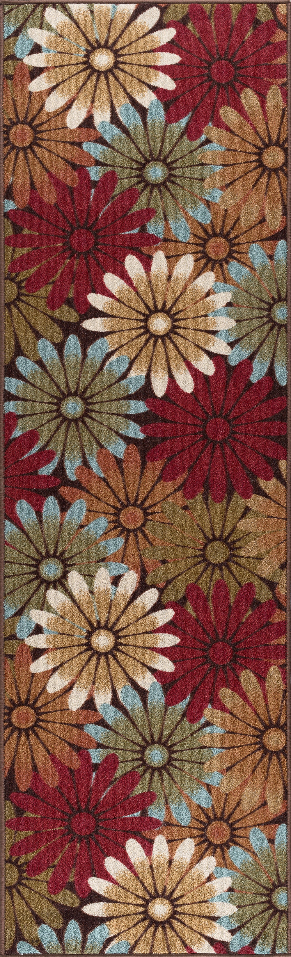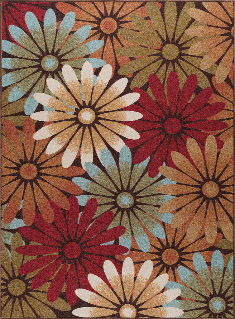 Create your own boho chic style with this bold floral printed transitional area rug. Unfurled daisy blossoms create a stunning design. Power loom, machine made of looped nylon yarn to be durable and affordable. In shades of brown, seafoam, beige, cranberry red, rust, and cream. Non-skid backing keeps it from sliding on wood, laminate, polished concrete, and tile floors, making this ideal for the kitchen, entryway, bathroom, or family room. Spot clean with mild detergent and water; vacuum on high-pile setting.