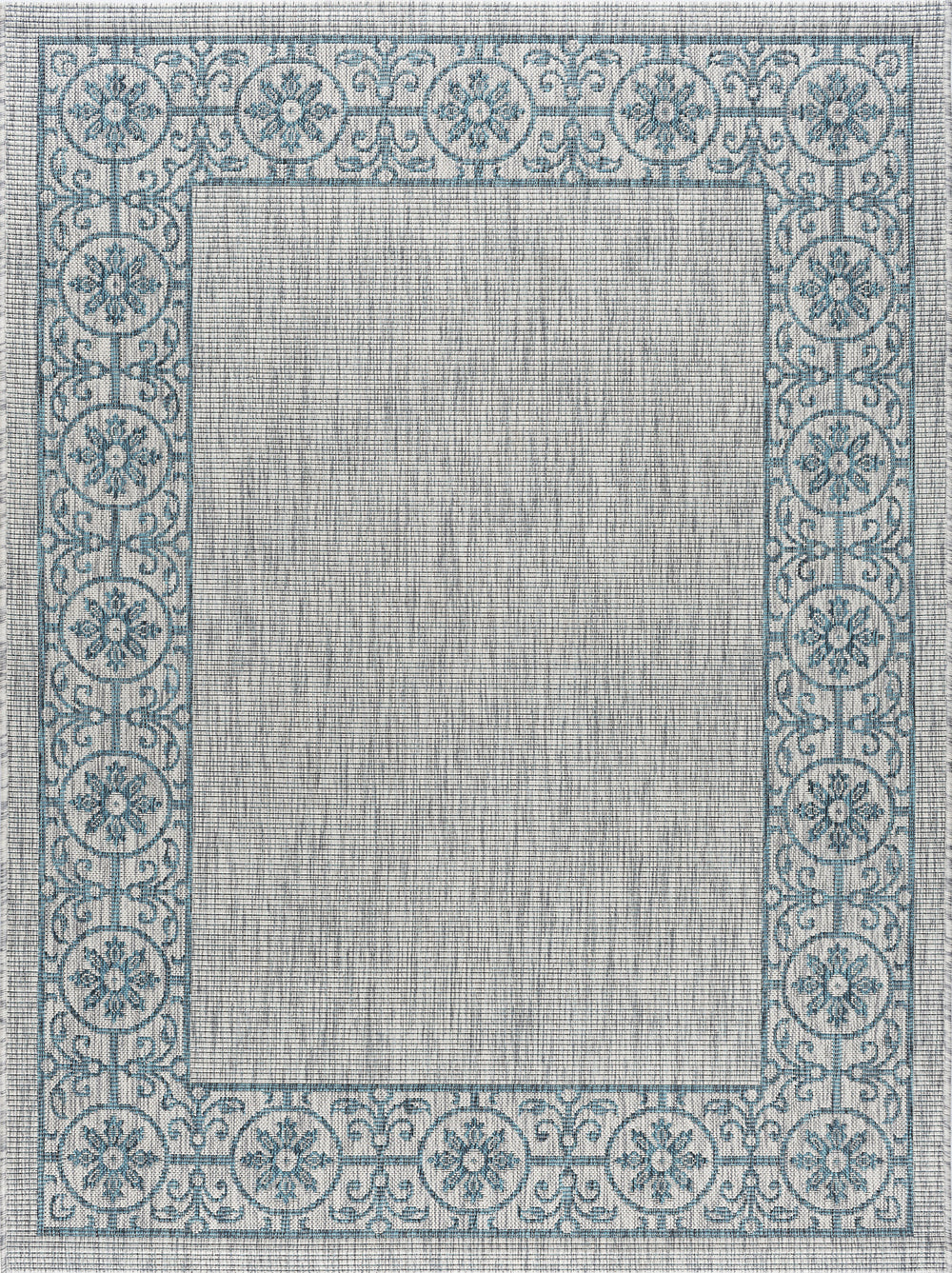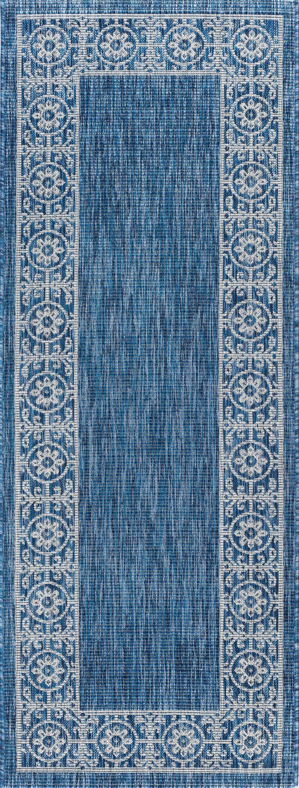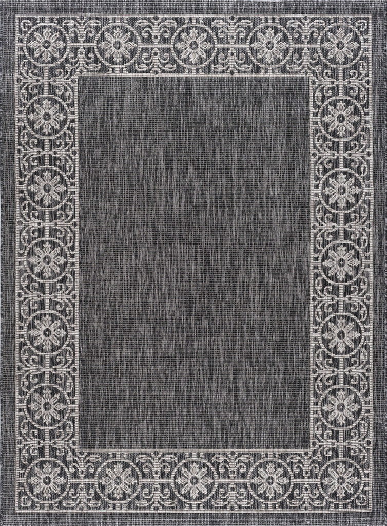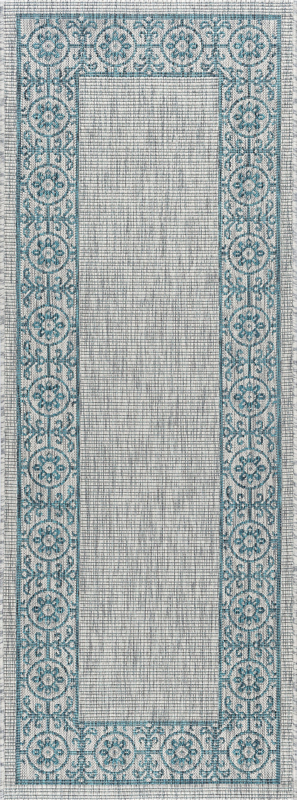 Make a cozy habitat by blending this traditional indoor or outdoor border design area rug into your décor. The classic pattern is enhanced with a floral motif on a heathered solid background. Perfect for an indoor mudroom, entryway, hallway, family room, kids room, basement, or anywhere you are looking for a durable and appealing solution. Machine made, power loomed of 100% polypropylene to stay fresh outdoors on a patio, porch, sunroom, portico, pavilion or deck. Clean with mild detergent and hose with water. Do not bleach.