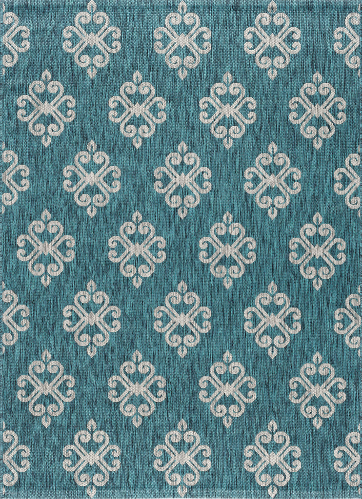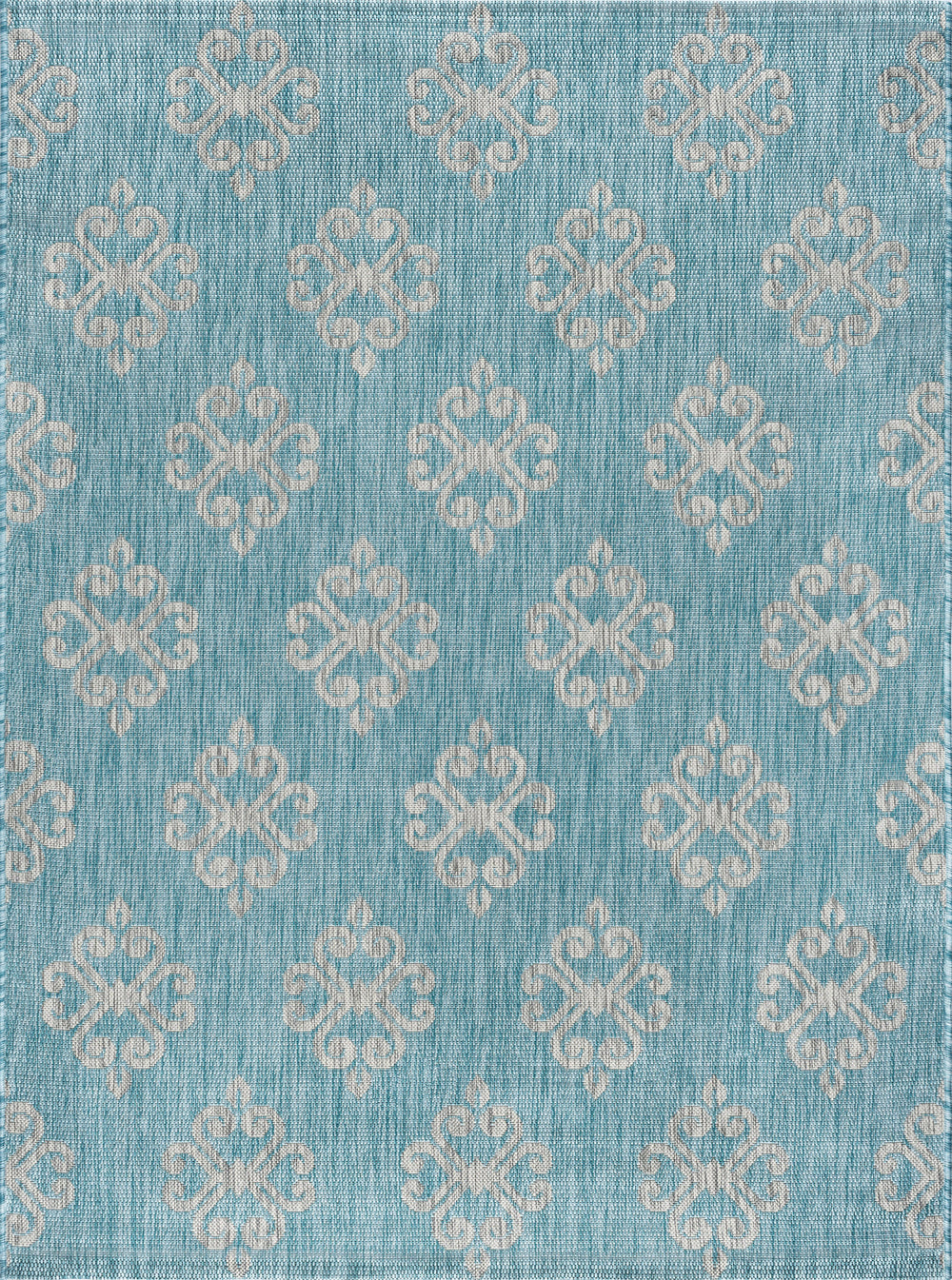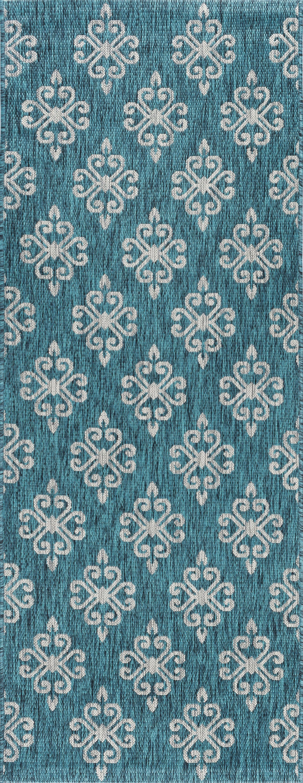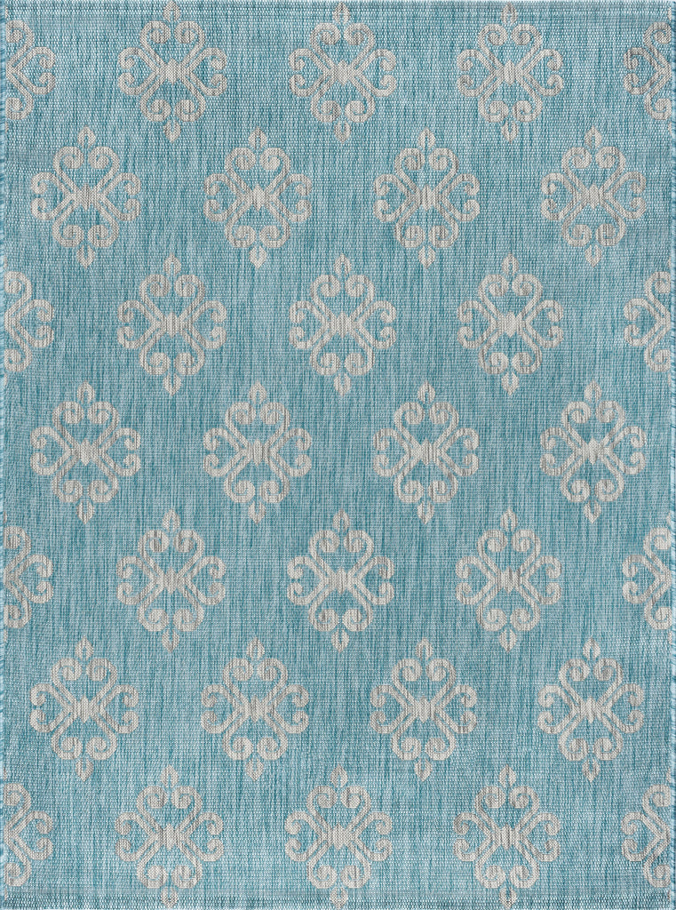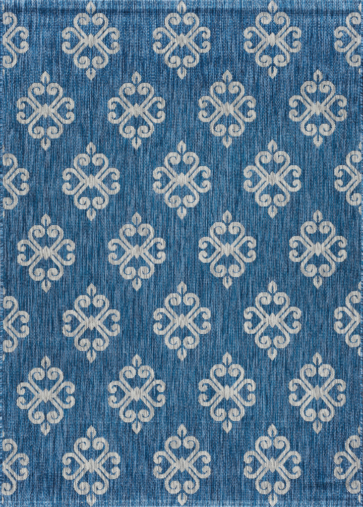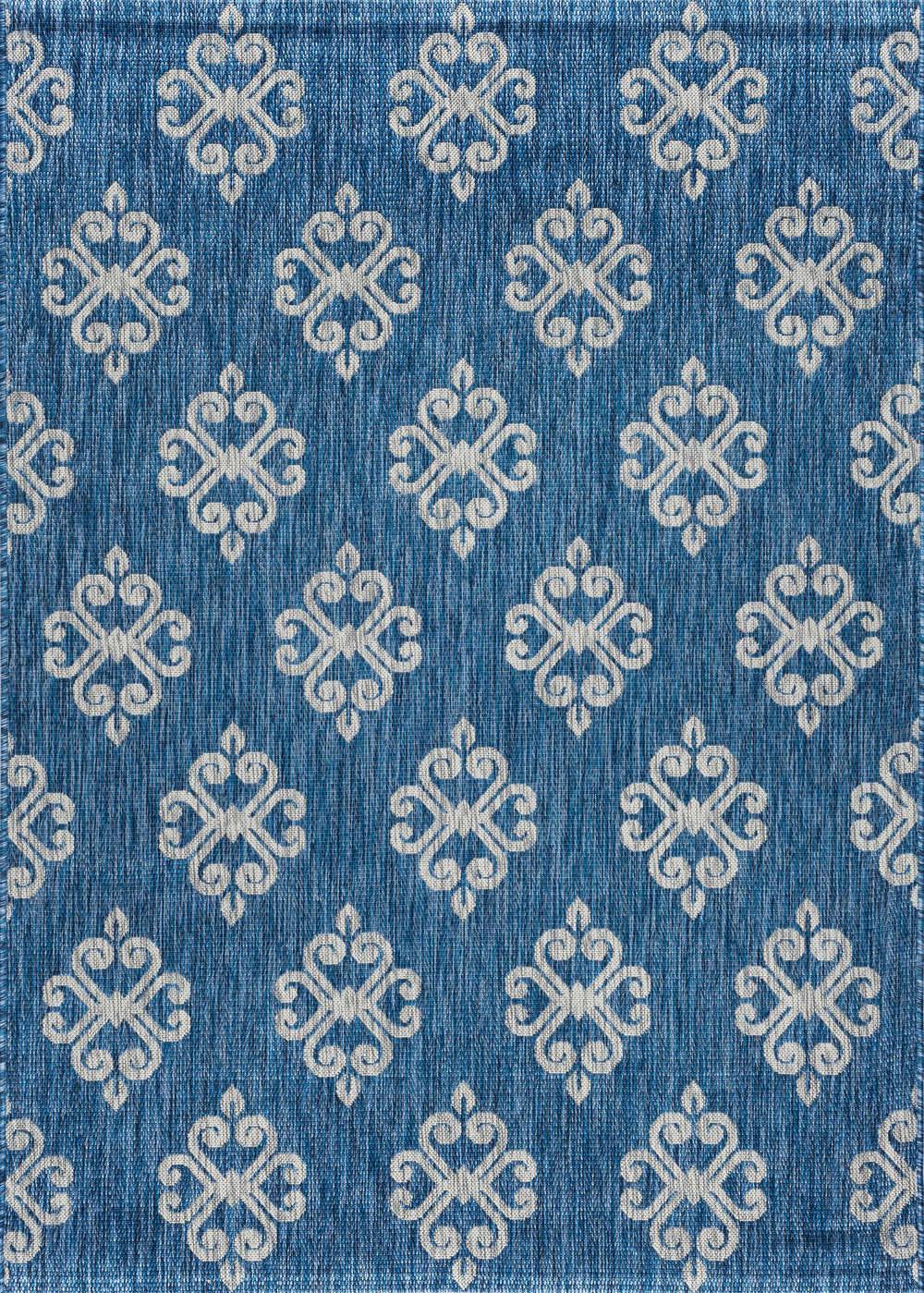 Update to a fresh new look with this indoor or outdoor filigree area rug. The marquise shaped medallions add the perfect touch to transitional, traditional, and contemporary décor. Perfect for an indoor mudroom, entryway, hallway, family room, kids room, basement, or anywhere you are looking for a durable and appealing solution. Machine made, power loomed of 100% polypropylene to stay fresh outdoors on a patio, porch, sunroom, portico, pavilion or deck. Clean with mild detergent and hose with water. Do not bleach.