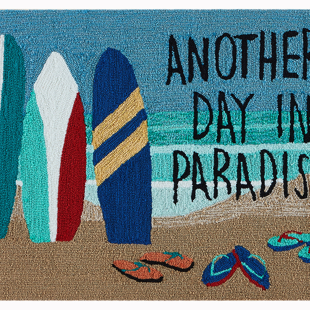 Bring paradise home with this fun and carefree beachy mat. Hand hooked of weather-resistant fiber, this collection is a blend of comfort, softness and durability. Frontporch is remarkably easy to clean and treated for added fade resistance. Limiting exposure to rain, moisture and direct sun will prolong mat life.