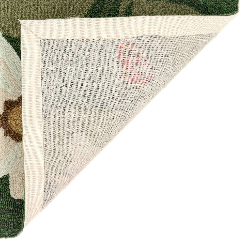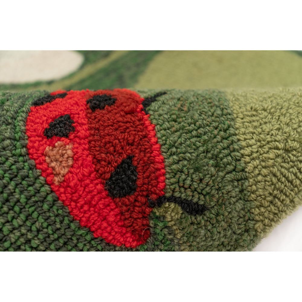 Add some good luck to your home with these 3 lucky ladybugs on a beautiful white garden flower. Hand hooked of weather-resistant fiber, this collection is a blend of comfort, softness and durability. Frontporch is remarkably easy to clean and treated for added fade resistance. Limiting exposure to rain, moisture and direct sun will prolong mat life.