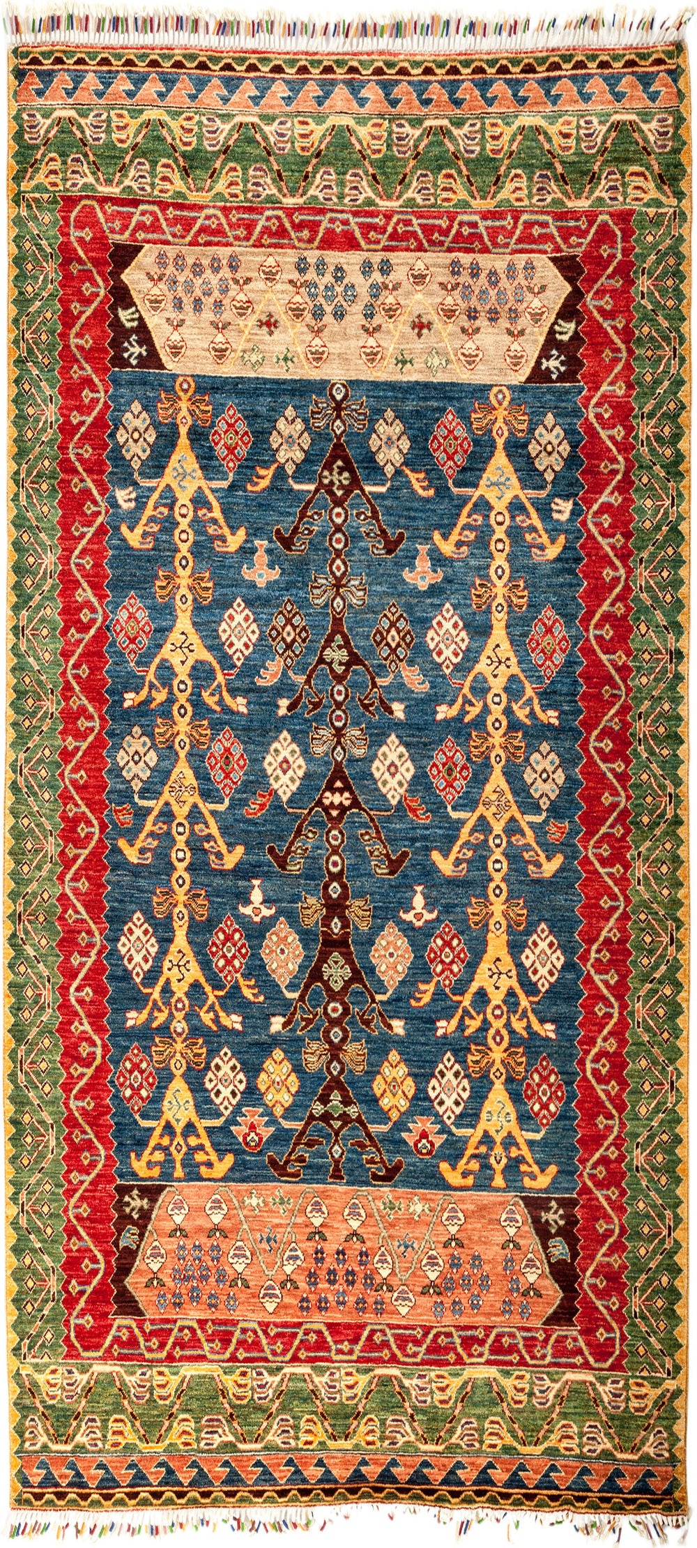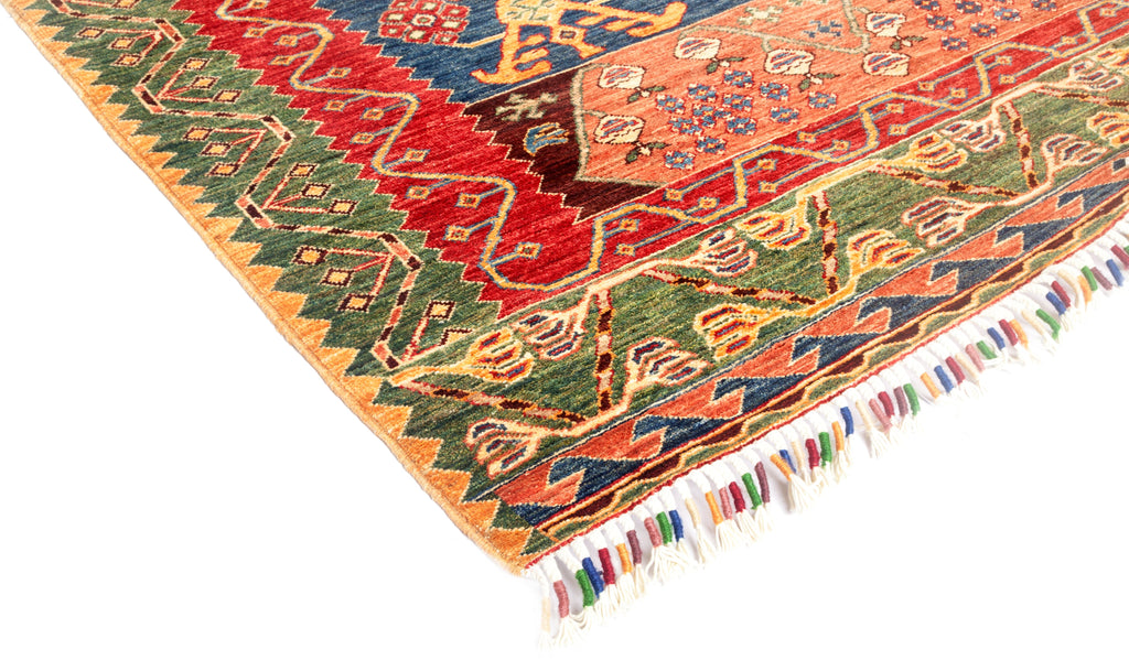 These area rugs resemble traditional Persian style tribal village designs. These rugs are bold, striking and colorful. South Persian tribal pieces, true Ziegler Sultanabads, and almost any non-urban Iranian weaving has been interpreted and creatively adapted. These carpets are directly appealing and therefore work well in any context, overall style or period.