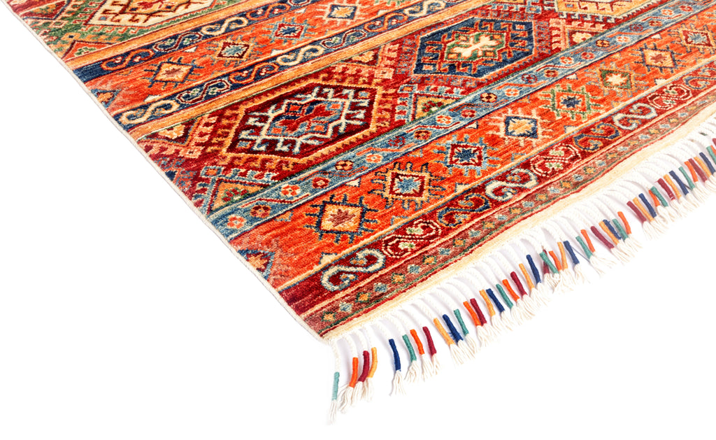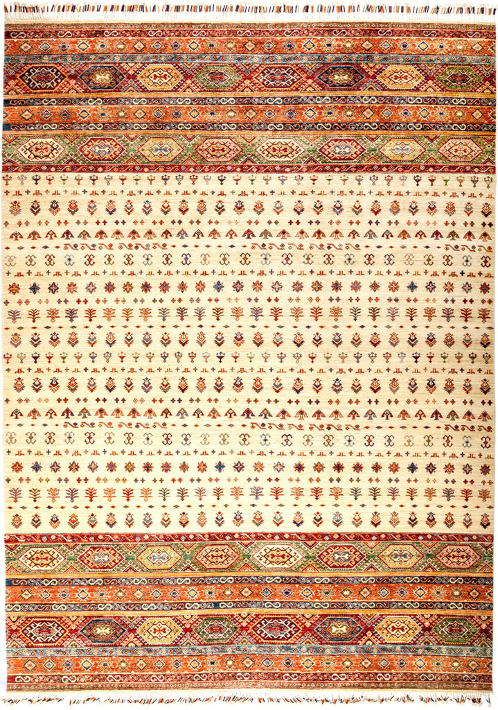 These area rugs resemble traditional Persian style tribal village designs. These rugs are bold, striking and colorful. South Persian tribal pieces, true Ziegler Sultanabads, and almost any non-urban Iranian weaving has been interpreted and creatively adapted. These carpets are directly appealing and therefore work well in any context, overall style or period.
