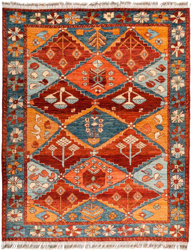 These area rugs resemble traditional Persian style tribal village designs. These rugs are bold, striking and colorful. South Persian tribal pieces, true Ziegler Sultanabads, and almost any non-urban Iranian weaving has been interpreted and creatively adapted. These carpets are directly appealing and therefore work well in any context, overall style or period.