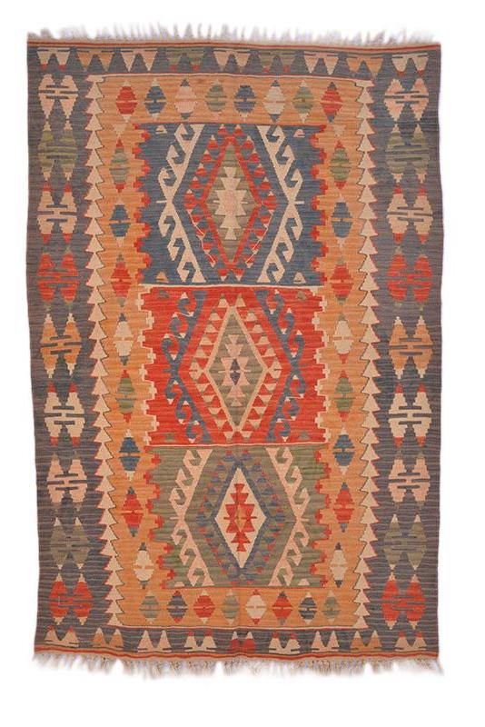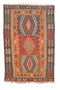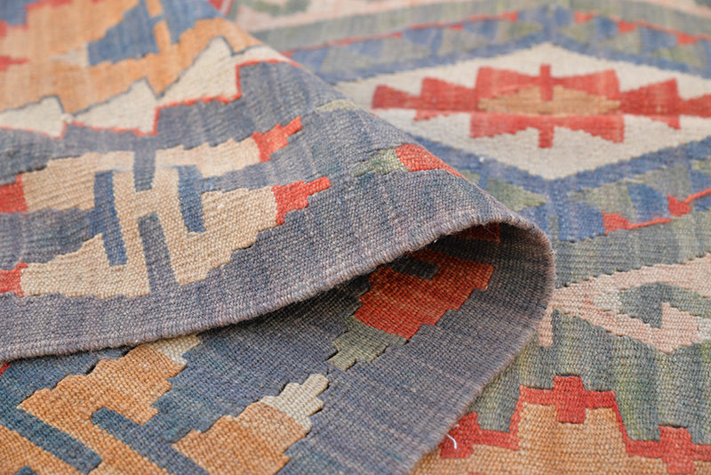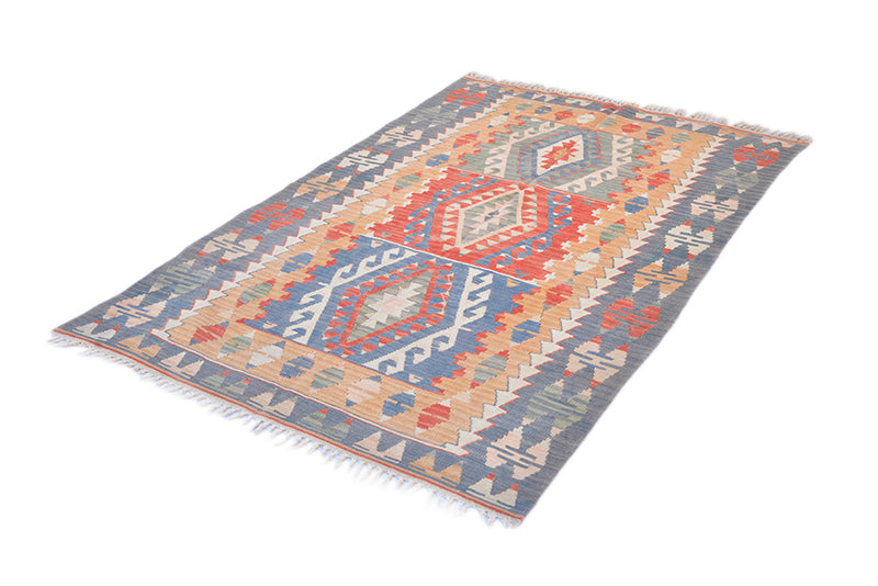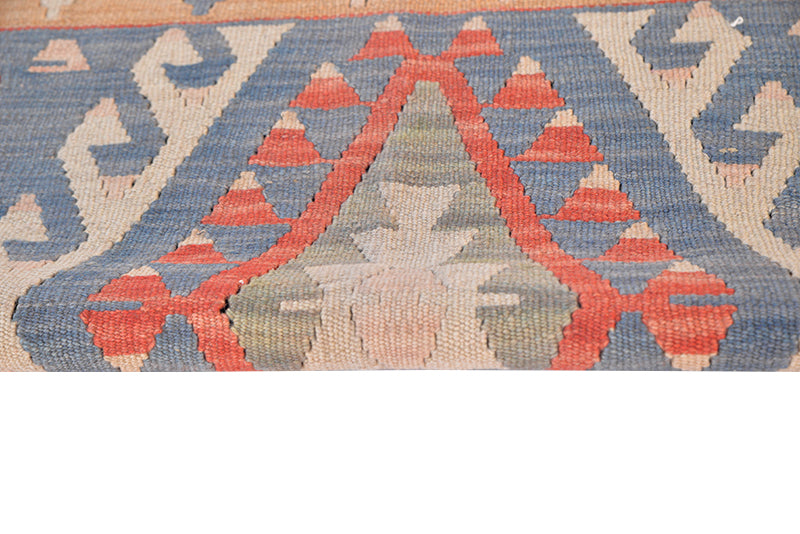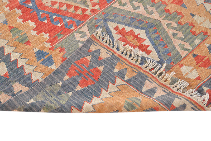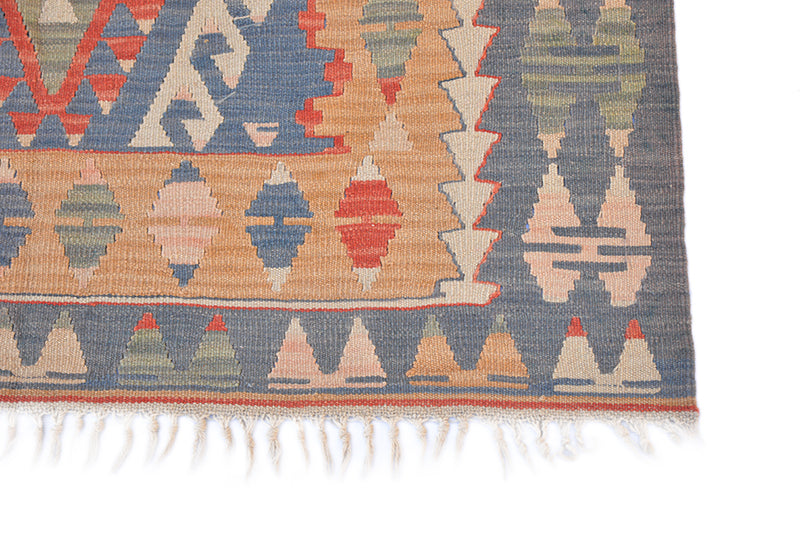 An absolutely breath-taking design in soft, vivid colors is what defines this Persian rug from the Turkish Kilim collection. Hand-crafted using high-quality Turkish wool cotton, this rug measuring 5'9" x 3'10" features a tribal pattern divided in three parts. Soft colored border gives way to outlines and shapes which further give way to geometrical shapes in bold colors. All the colors are chosen skillfully to create unique contrast throughout the piece and result in clearly defined lines which convey purpose and motion. The center of the rug features several lines and shapes that come together to form a hexagonal pattern. Art lovers would surely fall in love with this tribal rug designed to take your interior to the next level.