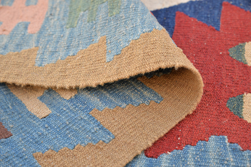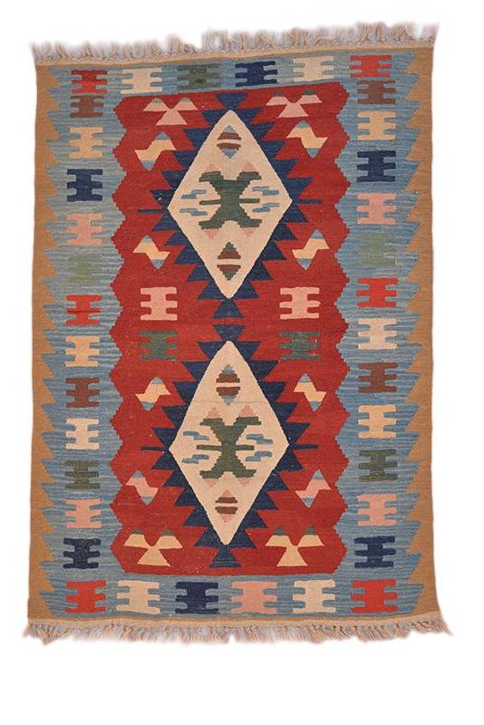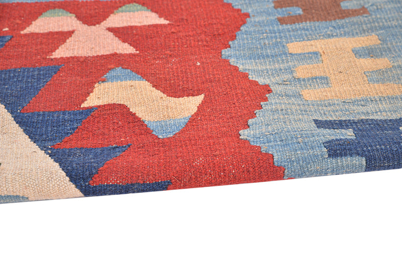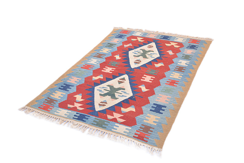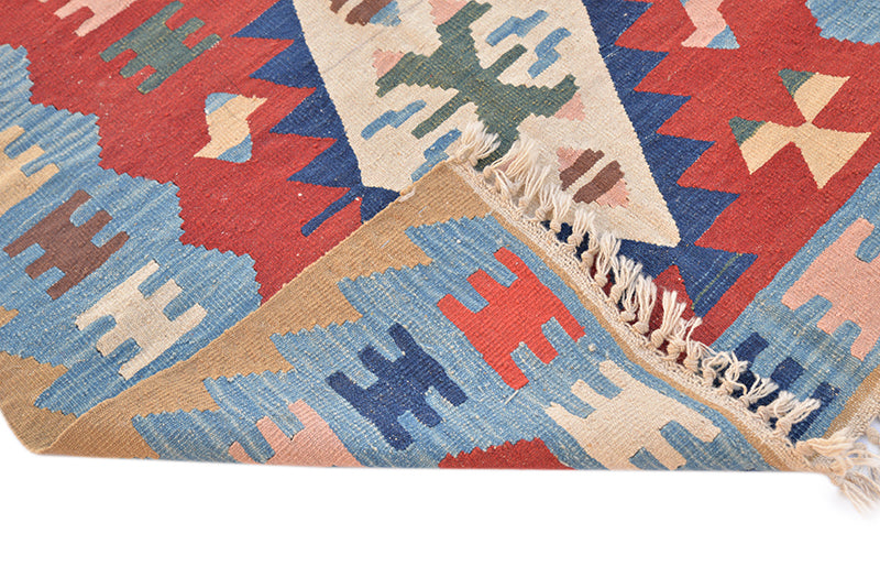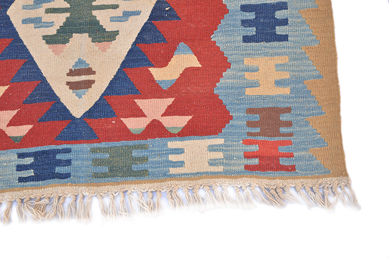Awe-striking design, brilliant posh shades and flawless entwining of Turkish craftsmanship describe the beauty of this Turkish Kilim! Go ahead decking your lounge area, patio or your living room with this flat-woven accent piece for an incomparable elegance and instant styling to happen. Measuring 3' 9" height and 5' 4" width, you get an accentuated look that hikes up the beauty of your furniture and other decor elements as well. While the matchless medallion motifs in bold red, beige, light blue colors liven up your monochromatic room, the medallion motifs strewn all over adds to its exquisiteness. Do not overlook the distressed fading off happening on the borders, which can never go unnoticed!
