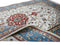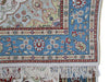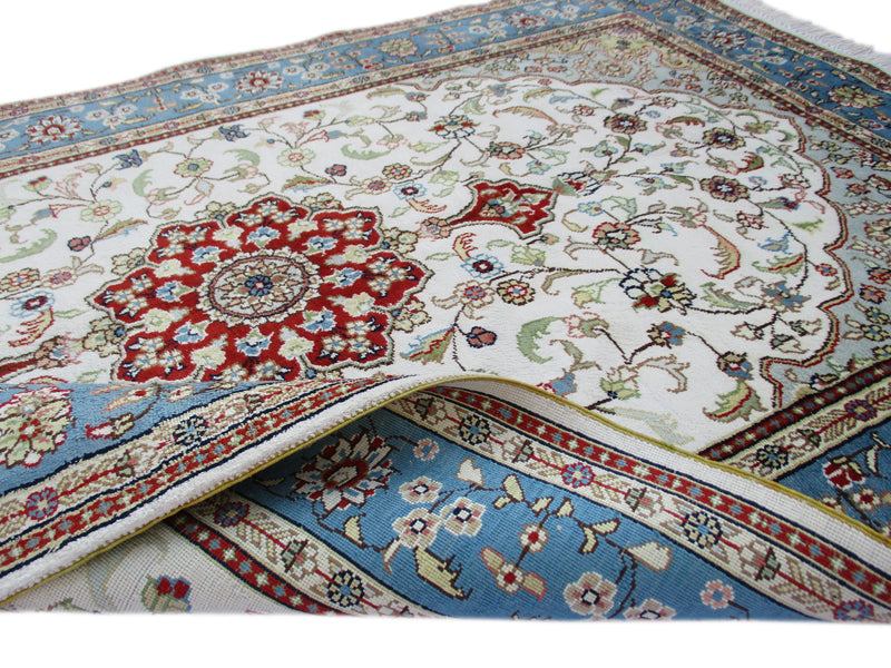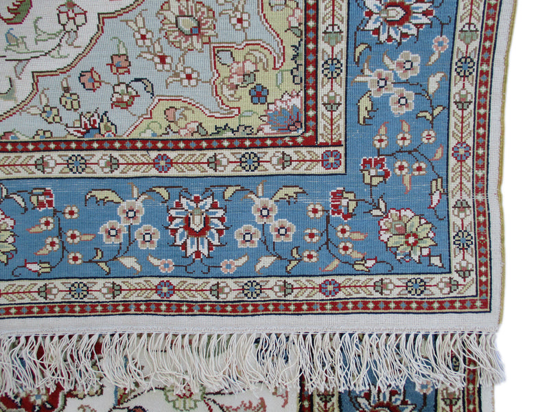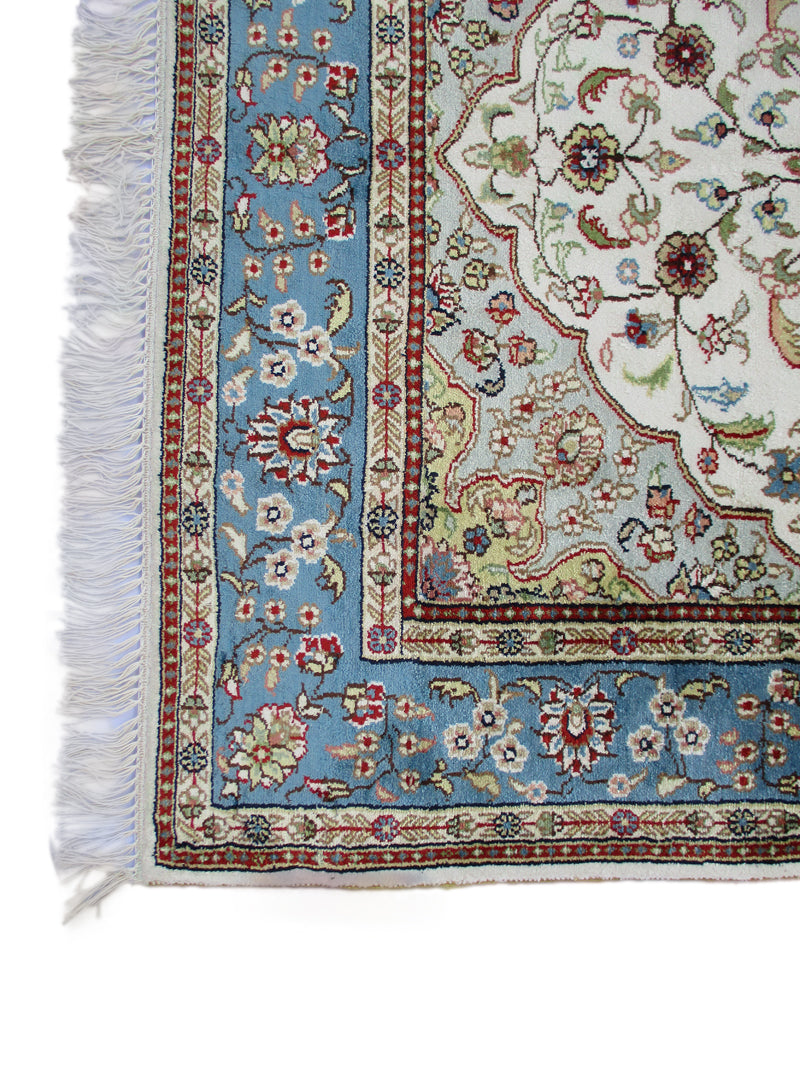 Striking vintage Persian Turkistan rug establishes a great balance of comfortable contrast despite the wide variety of elements throughout the core and borders. Creamy beige, light blue and turquoise tones stand out as the defining palette elements and the foreground colors are intended to stand against the lighter background to draw more attention to the intricate design. The effect is highly prevalent at the thick border in turquoise and towards the center of the vintage rug where the beige plain hosts a multitude of petals, winding fronds and floral booms. Deeper in its design at the rug's heart, viewers are treated to a bright red mandala which unifies the overall theme of the Turkistan rug made in oriental silk to give you the soft and soothing touch in your living room decor.
