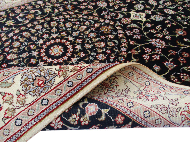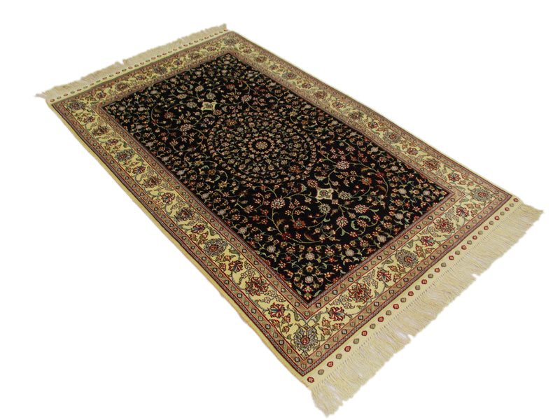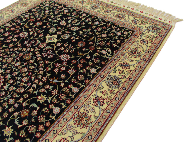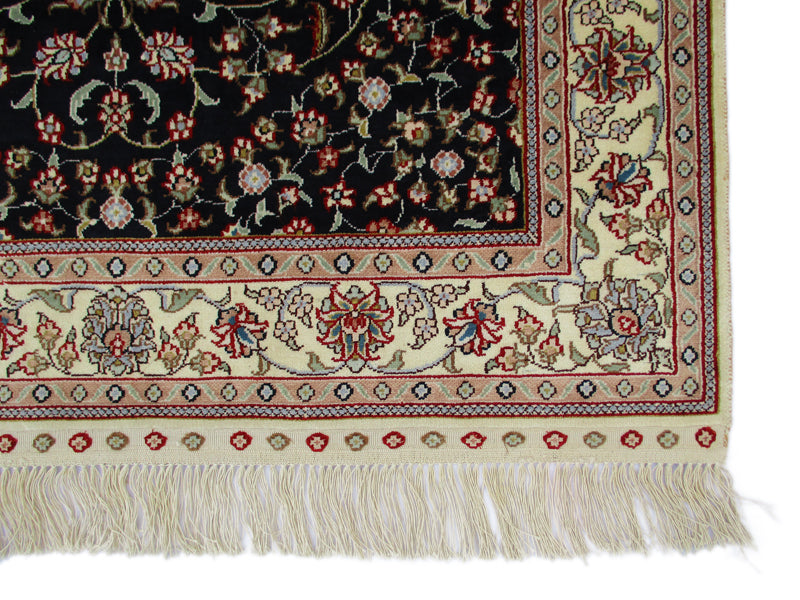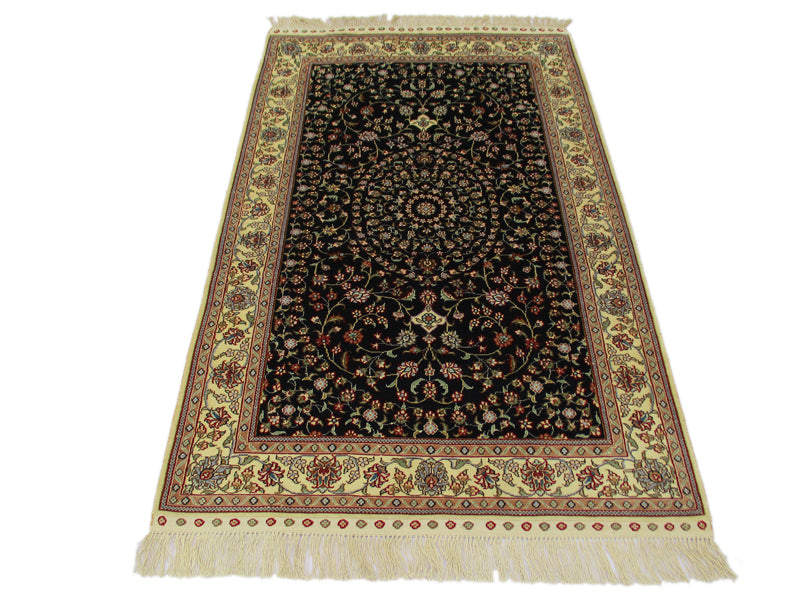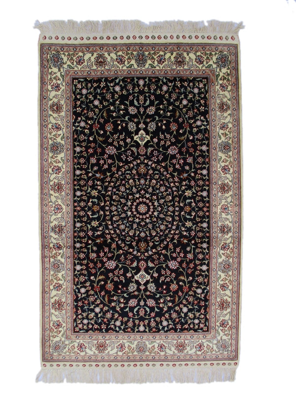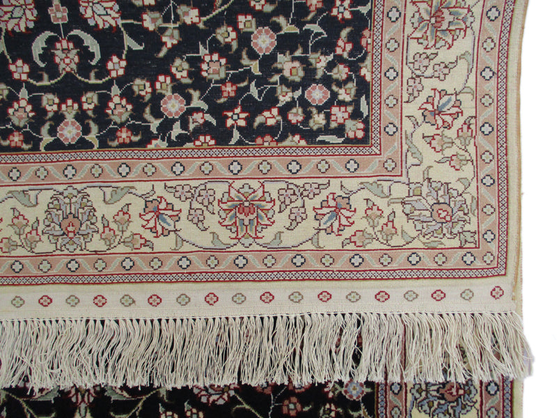 Sure to take your breath away with its elegant yet attractive design, this vintage Persian rug is stunningly crafted by using a black background color that highlights the lighter shades of the border in classic formal pattern. Vines and flowers swirl around the entire field highlighting the contrasting colors all over the design. Together they come to create a vintage Turkistan rug that makes any room turn into a grand palace hall. These rugs are known for being finer and more elegant Persian rugs. The central medallion surrounded by two pendant designs impart a greater sense of scale to the length of the rug. This finely woven rug in size 4'11"x3' showcases exquisite creativity, skill and artistry which is apparent through the use of colors and intricacy of the design elements.