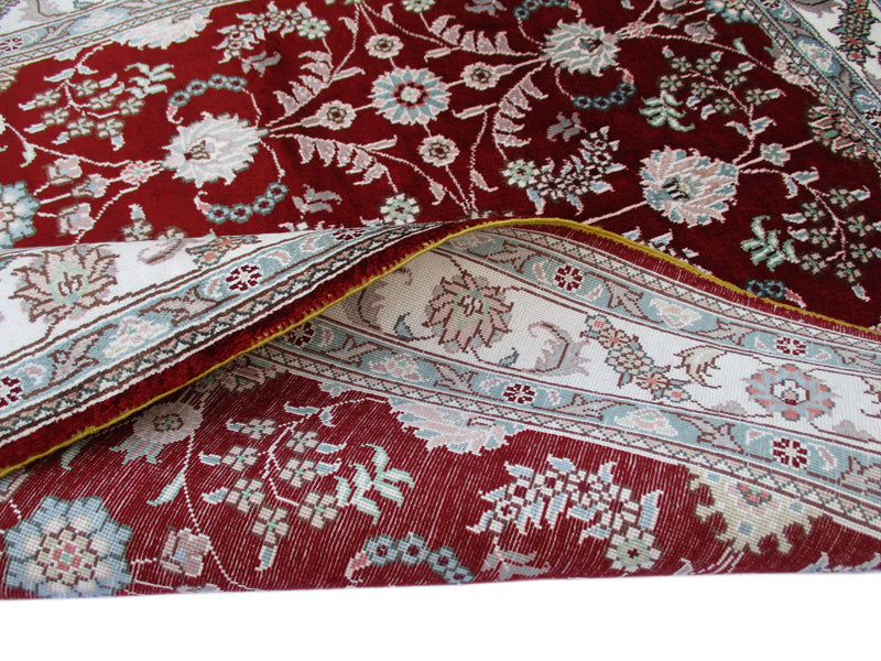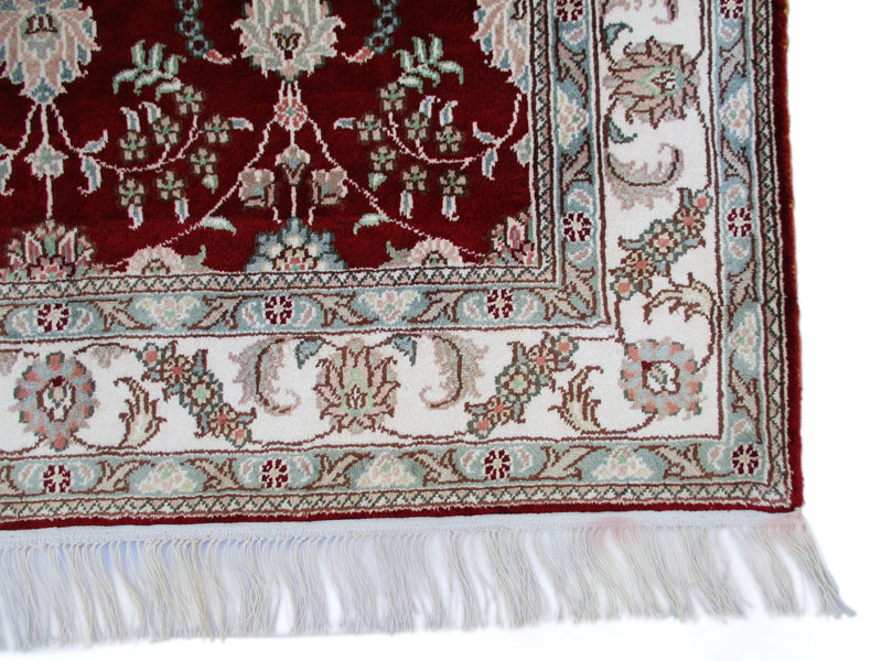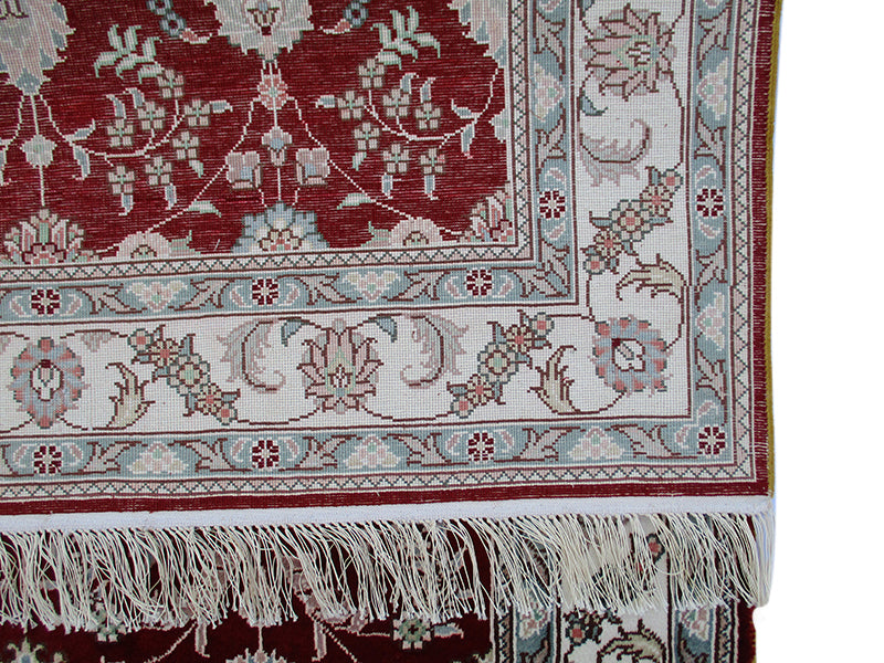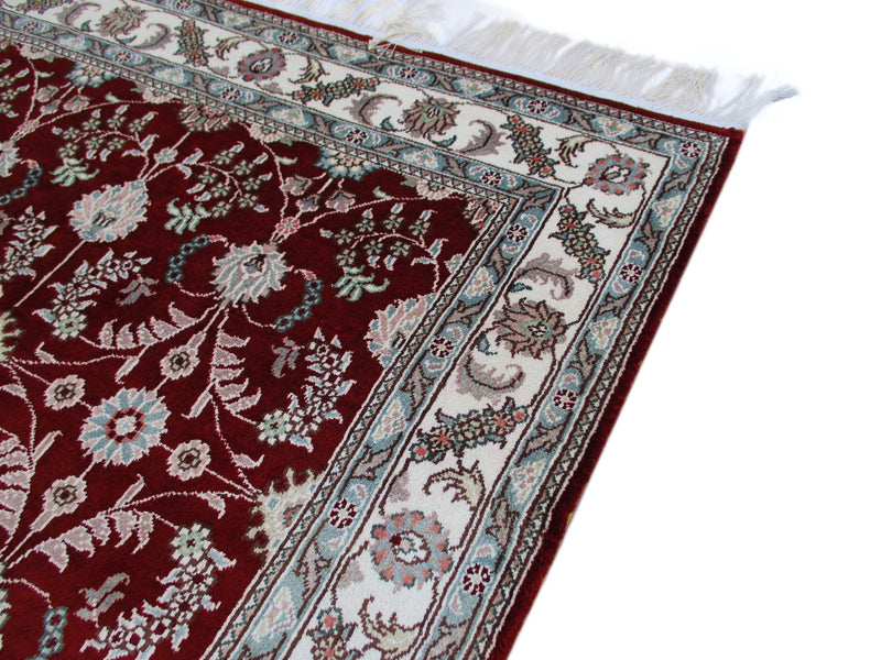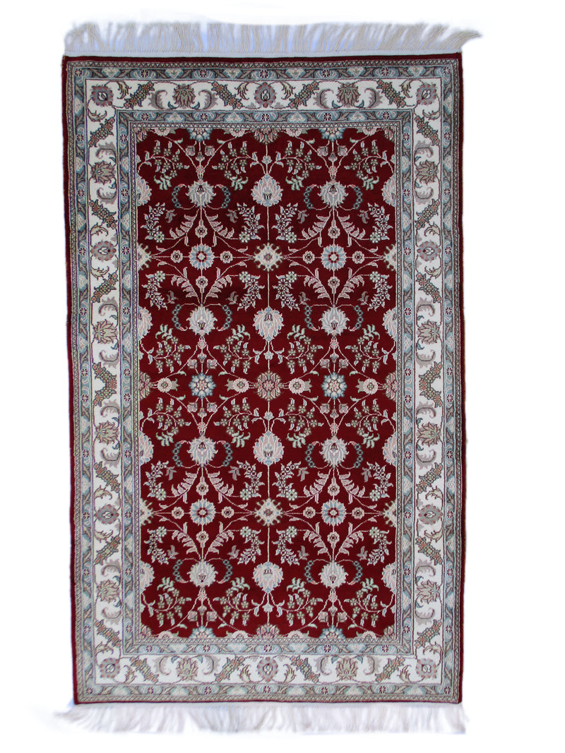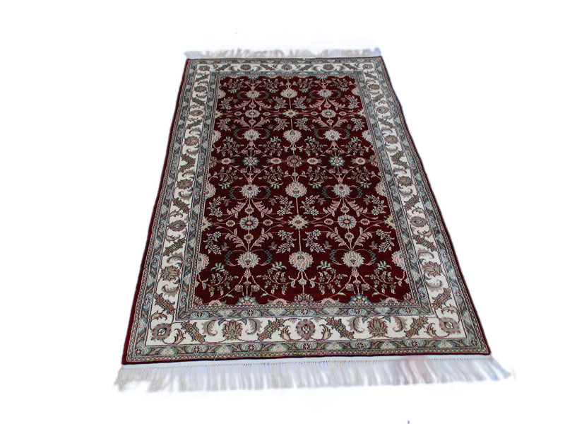 An alluring array of flowers spreading over the dark red field of this beautiful antique Persian carpet makes it a pleasant addition to any contemporary decor. A series of white blossoms form the primary element of the pattern each surrounded by leaves and stems in network leading towards the outward. Crisp lines connect these elements to create an intricate detail throughout the core of the rug. A large band of vines and flowers arranged in regular arrangement form the border accompanied by two thin borders featuring similar motifs. Soft, muted greyish tone throughout the borders provide a great contrast to the bright center making it more visible and eye-catching. The Turkistan rug is 5' long and 3' wide and suits any space in home or office for some soft and luxurious treatment.