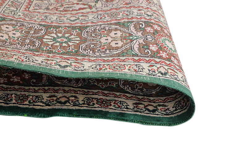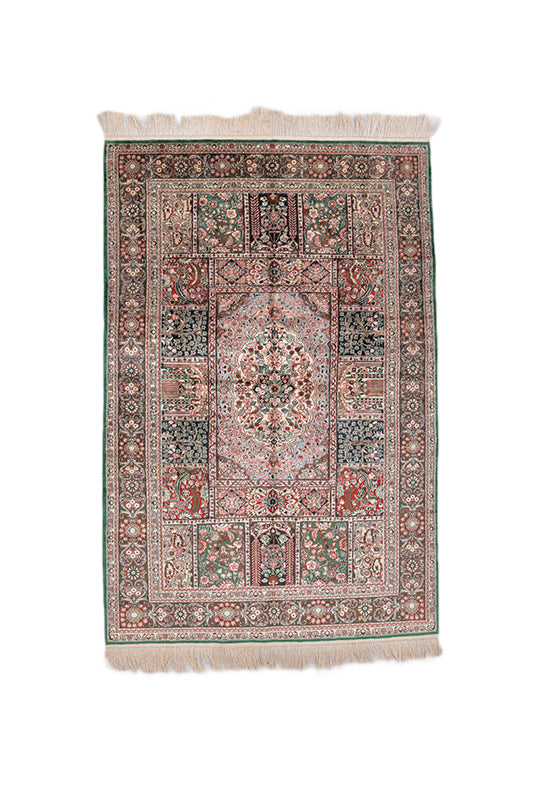 Flourishing beautifully and eye-catching like none other, this Turkistan rug in Persian style demonstrates the effect resembling the unfurling of colorful pyrotechnics. The vintage rug's central medallion is blossom-shaped and shaded in a vibrant blend of blue, red and green. The centerpiece rests against a background of muted earthy tones filled with intricated detailing. Lines, florals and natural elements are distributed like jewelry in square-shaped boxes separated by thin borders to form the main area. Crafted in hand by skillful artisans using oriental wool, this rug ensures ease of use and durability. It is 5'10" long and 3'11" wide and is ideal for any living room or passage that needs a style update.