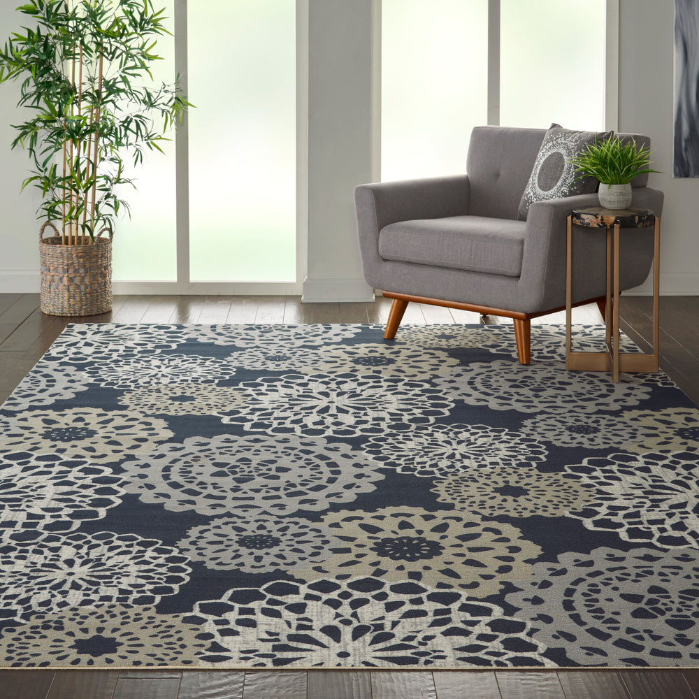 Stylized disks swirl and twirl in shades of grey and ivory on a navy black field, bringing a vibrant energy to this Rare Jewels rug from Waverly’s Sun N Shade Collection. Easy-care fibers are perfect for creating a lasting outdoor statement for your deck or patio.