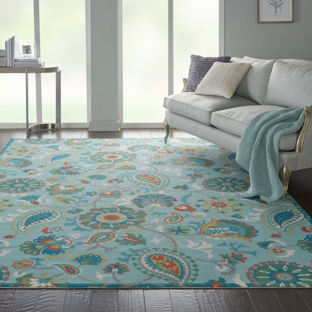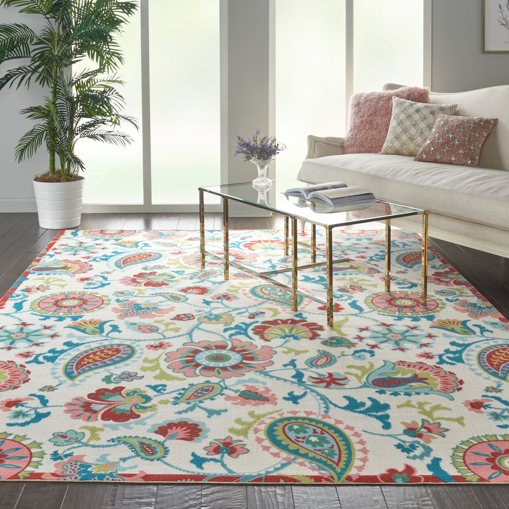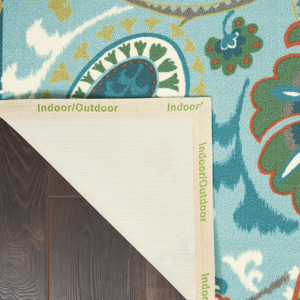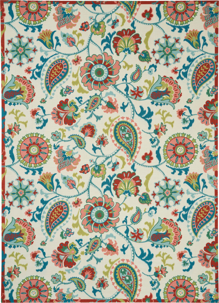 A classic floral and paisley design truly shines in brilliant multicolor shades, offset by an alluring ivory background. This Sirena Song indoor-outdoor rug from Waverly’s Sun N Shade Collection is expertly fabricated to withstand sun and storm, and brings life and fun to high traffic outdoors areas like patios and decks.