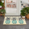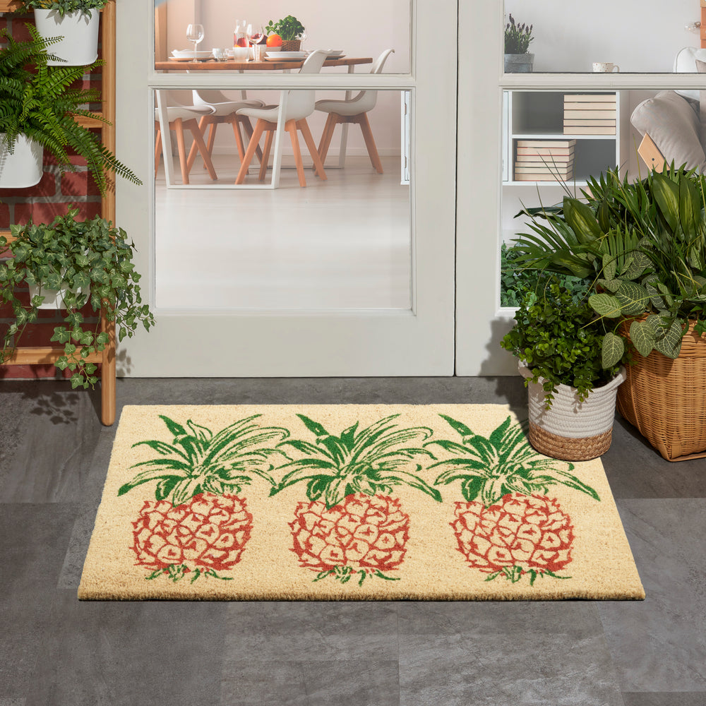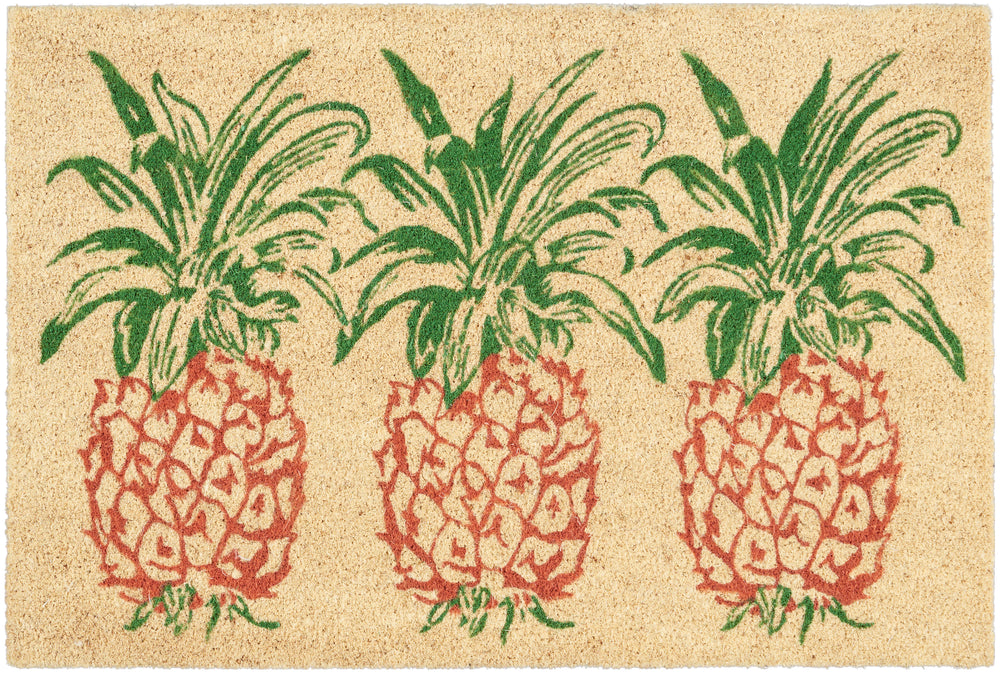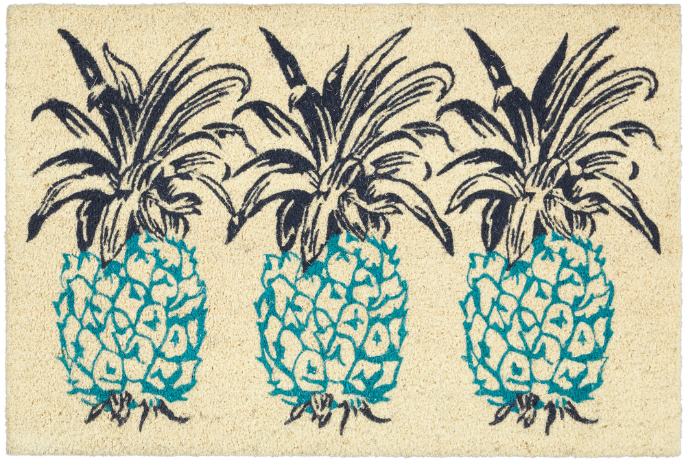 Bring the sunny vibes of a tropical oasis to your front door or entryway with this coastal doormat from the Waverly Greetings collection. This fun interpretation of a pineapple design is printed in deep navy and aqua hues for a fun and funky addition to your contemporary decor. Machine made from sturdy coir, a natural fiber that traps dirt from being tracked into your home.